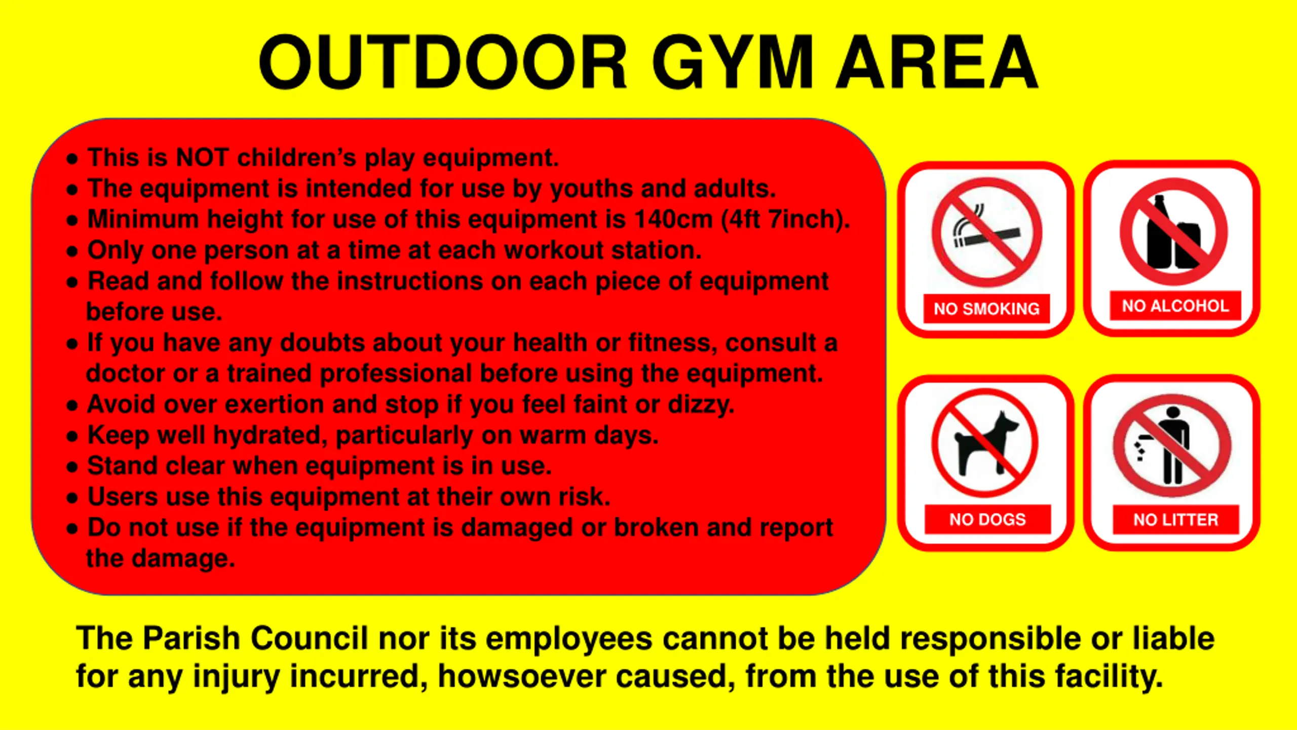 OUTDOOR GYM AREA This is NOT children s play equipment. The equipment is intended for use by youths and adults. Minimum height for use of this equipment is 140cm (4ft 7inch). Only one person at a time at each workout station. Read and follow the instructions on each piece of equipment before use. If you have any doubts about your health or fitness, consult a doctor or a trained professional before using the equipment. Avoid over exertion and stop if you feel faint or dizzy. Keep well hydrated, particularly on warm days. Stand clear when equipment is in use. Users use this equipment at their own risk. Do not use if the equipment is damaged or broken and report the damage. NO ALCOHOL NO SMOKING NO DOGS NO LITTER The Parish Council nor its employees cannot be held responsible or liable for any injury incurred, howsoever caused, from the use of this facility.