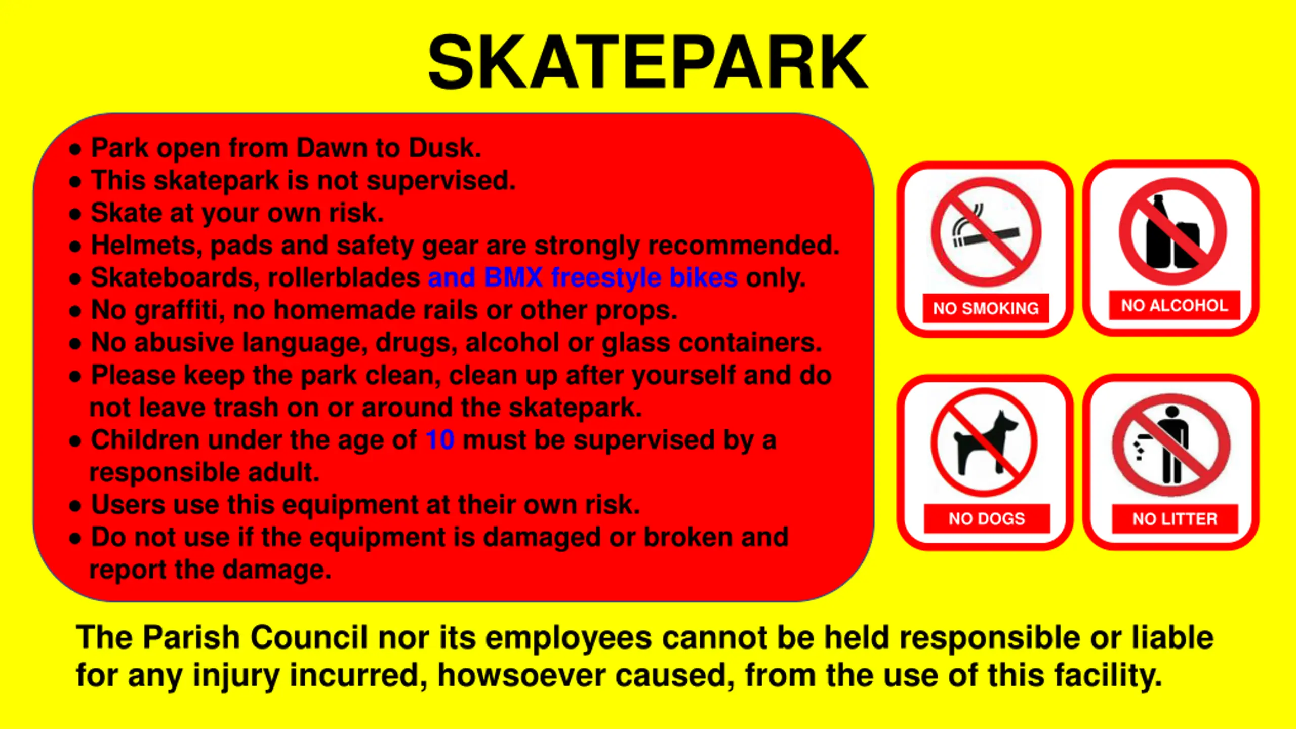 SKATEPARK Park open from Dawn to Dusk. This skatepark is not supervised. Skate at your own risk. Helmets, pads and safety gear are strongly recommended. Skateboards, rollerblades and BMX freestyle bikes only. No graffiti, no homemade rails or other props. No abusive language, drugs, alcohol or glass containers. Please keep the park clean, clean up after yourself and do not leave trash on or around the skatepark. Children under the age of 10 must be supervised by a responsible adult. Users use this equipment at their own risk. Do not use if the equipment is damaged or broken and report the damage. NO ALCOHOL NO SMOKING NO DOGS NO LITTER The Parish Council nor its employees cannot be held responsible or liable for any injury incurred, howsoever caused, from the use of this facility.