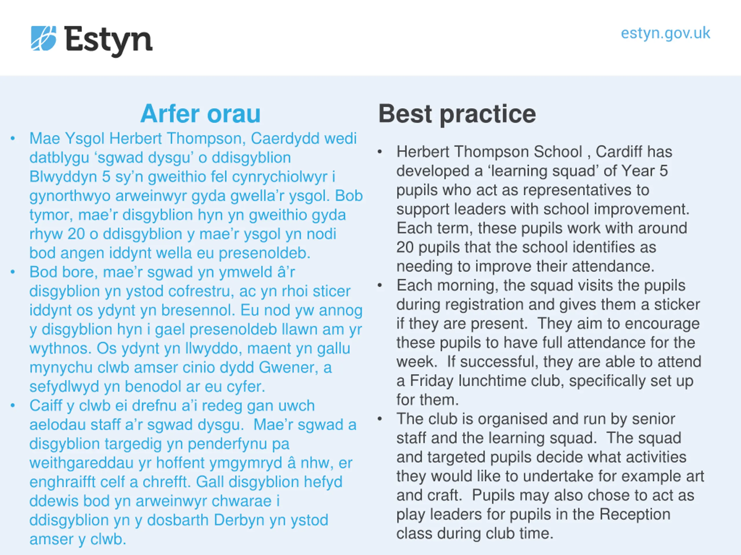Arfer orau Best practice Mae Ysgol Herbert Thompson, Caerdydd wedi datblygu sgwad dysgu o ddisgyblion Blwyddyn 5 sy n gweithio fel cynrychiolwyr i gynorthwyo arweinwyr gyda gwella r ysgol. Bob tymor, mae r disgyblion hyn yn gweithio gyda rhyw 20 o ddisgyblion y mae r ysgol yn nodi bod angen iddynt wella eu presenoldeb. Bod bore, mae r sgwad yn ymweld r disgyblion yn ystod cofrestru, ac yn rhoi sticer iddynt os ydynt yn bresennol. Eu nod yw annog y disgyblion hyn i gael presenoldeb llawn am yr wythnos. Os ydynt yn llwyddo, maent yn gallu mynychu clwb amser cinio dydd Gwener, a sefydlwyd yn benodol ar eu cyfer. Caiff y clwb ei drefnu a i redeg gan uwch aelodau staff a r sgwad dysgu. Mae r sgwad a disgyblion targedig yn penderfynu pa weithgareddau yr hoffent ymgymryd nhw, er enghraifft celf a chrefft. Gall disgyblion hefyd ddewis bod yn arweinwyr chwarae i ddisgyblion yn y dosbarth Derbyn yn ystod amser y clwb. Herbert Thompson School , Cardiff has developed a learning squad of Year 5 pupils who act as representatives to support leaders with school improvement. Each term, these pupils work with around 20 pupils that the school identifies as needing to improve their attendance. Each morning, the squad visits the pupils during registration and gives them a sticker if they are present. They aim to encourage these pupils to have full attendance for the week. If successful, they are able to attend a Friday lunchtime club, specifically set up for them. The club is organised and run by senior staff and the learning squad. The squad and targeted pupils decide what activities they would like to undertake for example art and craft. Pupils may also chose to act as play leaders for pupils in the Reception class during club time.