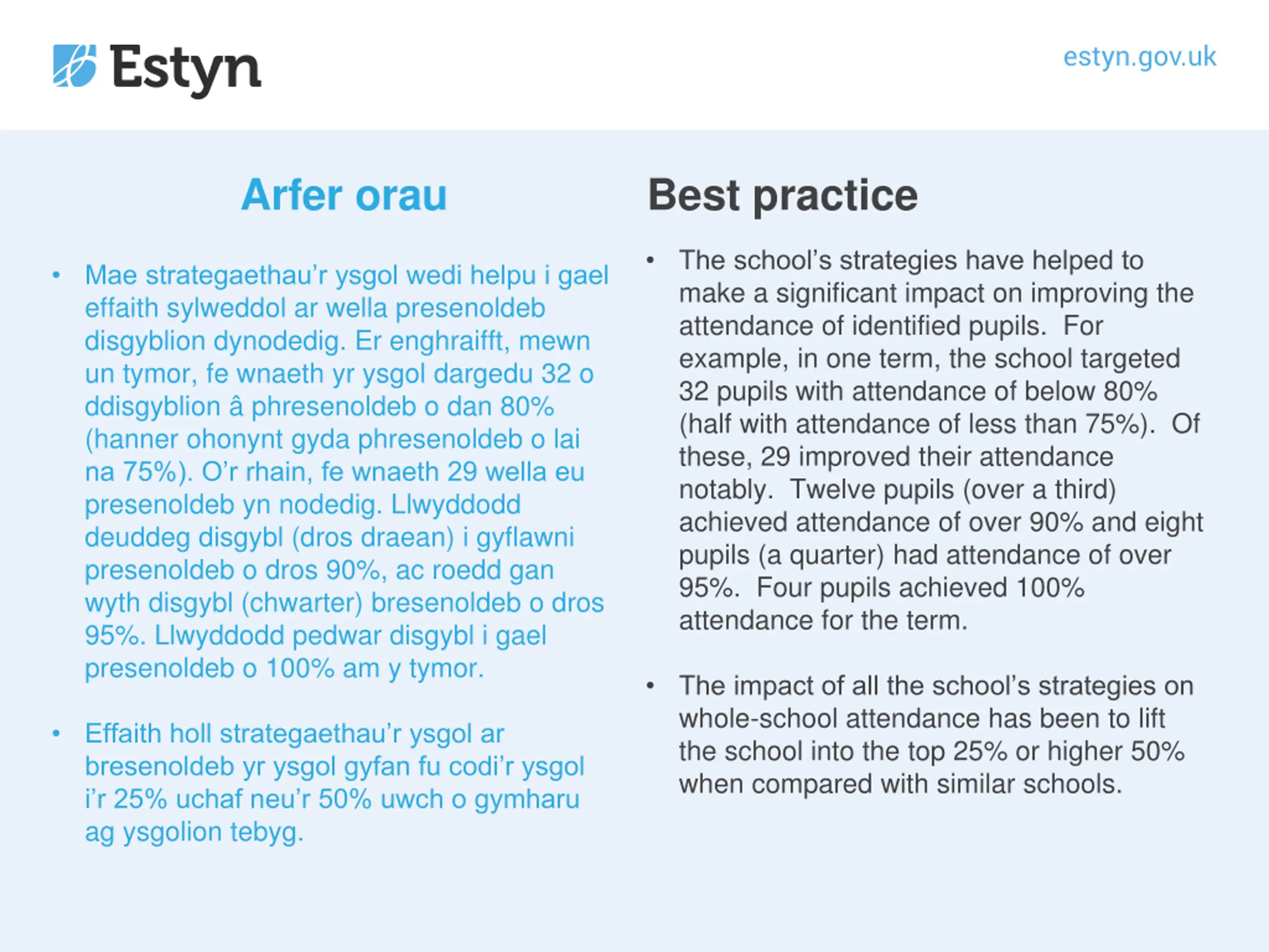 Arfer orau Best practice The school s strategies have helped to make a significant impact on improving the attendance of identified pupils. For example, in one term, the school targeted 32 pupils with attendance of below 80% (half with attendance of less than 75%). Of these, 29 improved their attendance notably. Twelve pupils (over a third) achieved attendance of over 90% and eight pupils (a quarter) had attendance of over 95%. Four pupils achieved 100% attendance for the term. Mae strategaethau r ysgol wedi helpu i gael effaith sylweddol ar wella presenoldeb disgyblion dynodedig. Er enghraifft, mewn un tymor, fe wnaeth yr ysgol dargedu 32 o ddisgyblion phresenoldeb o dan 80% (hanner ohonynt gyda phresenoldeb o lai na 75%). O r rhain, fe wnaeth 29 wella eu presenoldeb yn nodedig. Llwyddodd deuddeg disgybl (dros draean) i gyflawni presenoldeb o dros 90%, ac roedd gan wyth disgybl (chwarter) bresenoldeb o dros 95%. Llwyddodd pedwar disgybl i gael presenoldeb o 100% am y tymor. The impact of all the school s strategies on whole-school attendance has been to lift the school into the top 25% or higher 50% when compared with similar schools. Effaith holl strategaethau r ysgol ar bresenoldeb yr ysgol gyfan fu codi r ysgol i r 25% uchaf neu r 50% uwch o gymharu ag ysgolion tebyg.