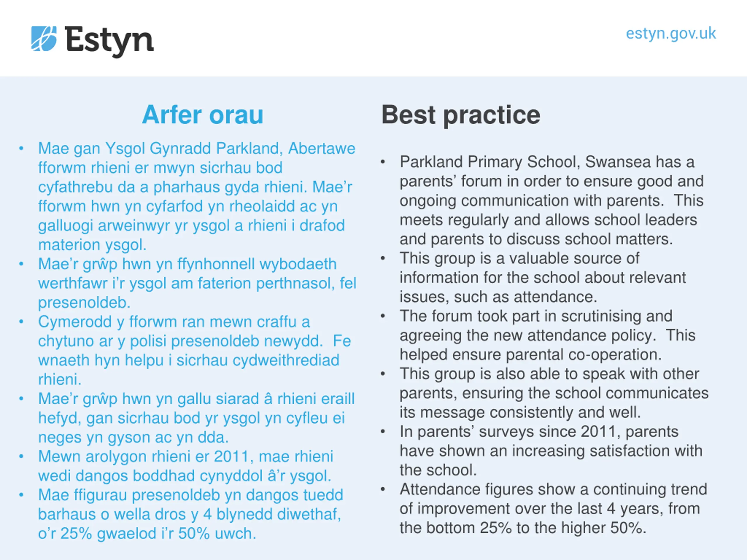 Arfer orau Best practice Mae gan Ysgol Gynradd Parkland, Abertawe fforwm rhieni er mwyn sicrhau bod cyfathrebu da a pharhaus gyda rhieni. Mae r fforwm hwn yn cyfarfod yn rheolaidd ac yn galluogi arweinwyr yr ysgol a rhieni i drafod materion ysgol. Mae r gr p hwn yn ffynhonnell wybodaeth werthfawr i r ysgol am faterion perthnasol, fel presenoldeb. Cymerodd y fforwm ran mewn craffu a chytuno ar y polisi presenoldeb newydd. Fe wnaeth hyn helpu i sicrhau cydweithrediad rhieni. Mae r gr p hwn yn gallu siarad rhieni eraill hefyd, gan sicrhau bod yr ysgol yn cyfleu ei neges yn gyson ac yn dda. Mewn arolygon rhieni er 2011, mae rhieni wedi dangos boddhad cynyddol r ysgol. Mae ffigurau presenoldeb yn dangos tuedd barhaus o wella dros y 4 blynedd diwethaf, o r 25% gwaelod i r 50% uwch. Parkland Primary School, Swansea has a parents forum in order to ensure good and ongoing communication with parents. This meets regularly and allows school leaders and parents to discuss school matters. This group is a valuable source of information for the school about relevant issues, such as attendance. The forum took part in scrutinising and agreeing the new attendance policy. This helped ensure parental co-operation. This group is also able to speak with other parents, ensuring the school communicates its message consistently and well. In parents surveys since 2011, parents have shown an increasing satisfaction with the school. Attendance figures show a continuing trend of improvement over the last 4 years, from the bottom 25% to the higher 50%.