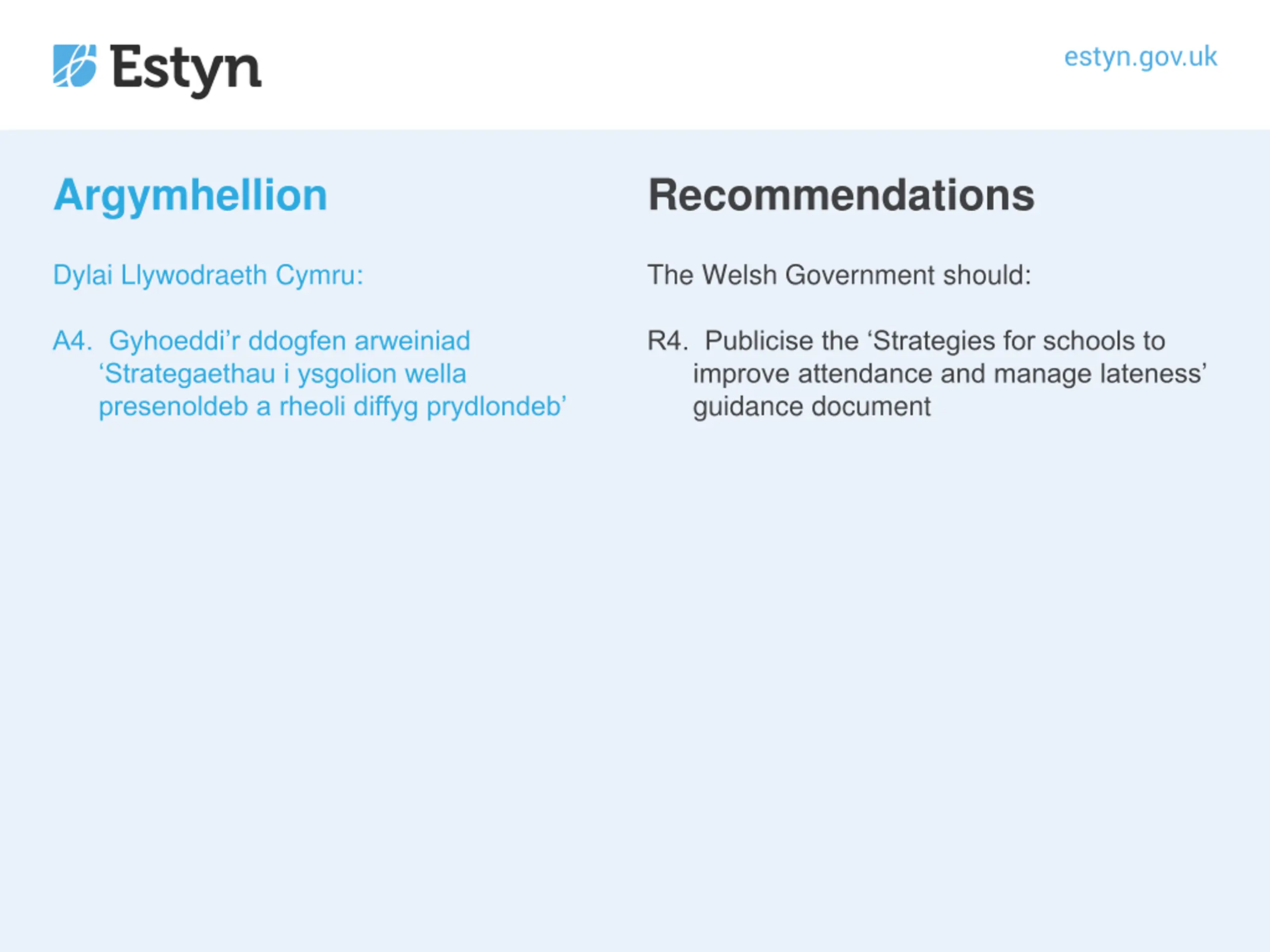 Argymhellion Recommendations Dylai Llywodraeth Cymru: The Welsh Government should: A4. Gyhoeddi r ddogfen arweiniad Strategaethau i ysgolion wella presenoldeb a rheoli diffyg prydlondeb R4. Publicise the Strategies for schools to improve attendance and manage lateness guidance document
