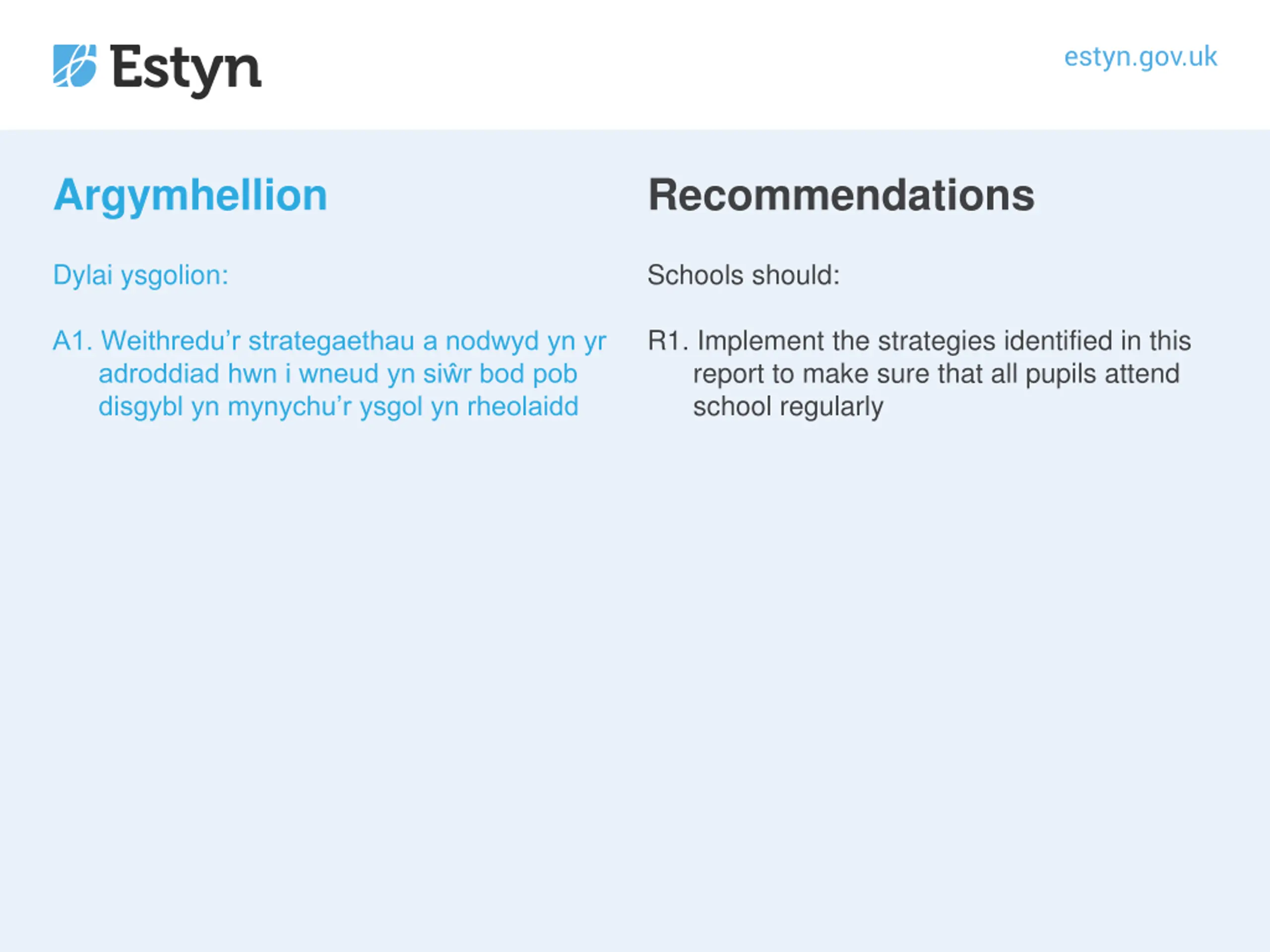 Argymhellion Recommendations Dylai ysgolion: Schools should: R1. Implement the strategies identified in this report to make sure that all pupils attend school regularly A1. Weithredu r strategaethau a nodwyd yn yr adroddiad hwn i wneud yn si r bod pob disgybl yn mynychu r ysgol yn rheolaidd
