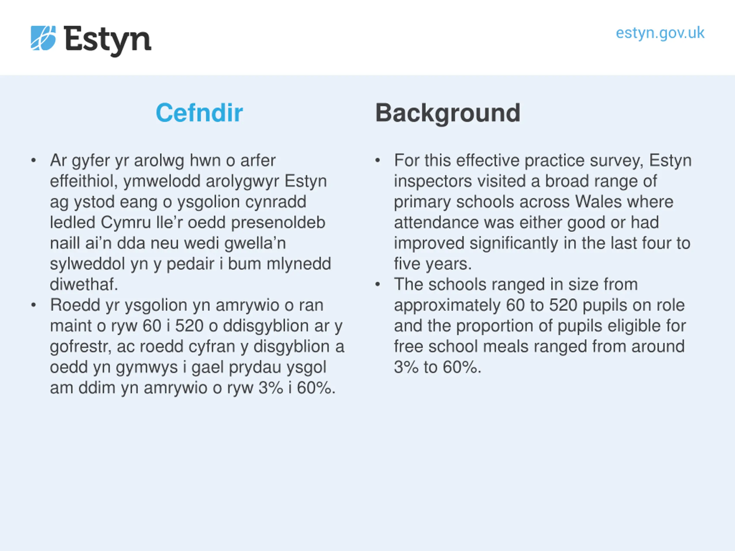 Cefndir Background Ar gyfer yr arolwg hwn o arfer effeithiol, ymwelodd arolygwyr Estyn ag ystod eang o ysgolion cynradd ledled Cymru lle r oedd presenoldeb naill ai n dda neu wedi gwella n sylweddol yn y pedair i bum mlynedd diwethaf. Roedd yr ysgolion yn amrywio o ran maint o ryw 60 i 520 o ddisgyblion ar y gofrestr, ac roedd cyfran y disgyblion a oedd yn gymwys i gael prydau ysgol am ddim yn amrywio o ryw 3% i 60%. For this effective practice survey, Estyn inspectors visited a broad range of primary schools across Wales where attendance was either good or had improved significantly in the last four to five years. The schools ranged in size from approximately 60 to 520 pupils on role and the proportion of pupils eligible for free school meals ranged from around 3% to 60%.