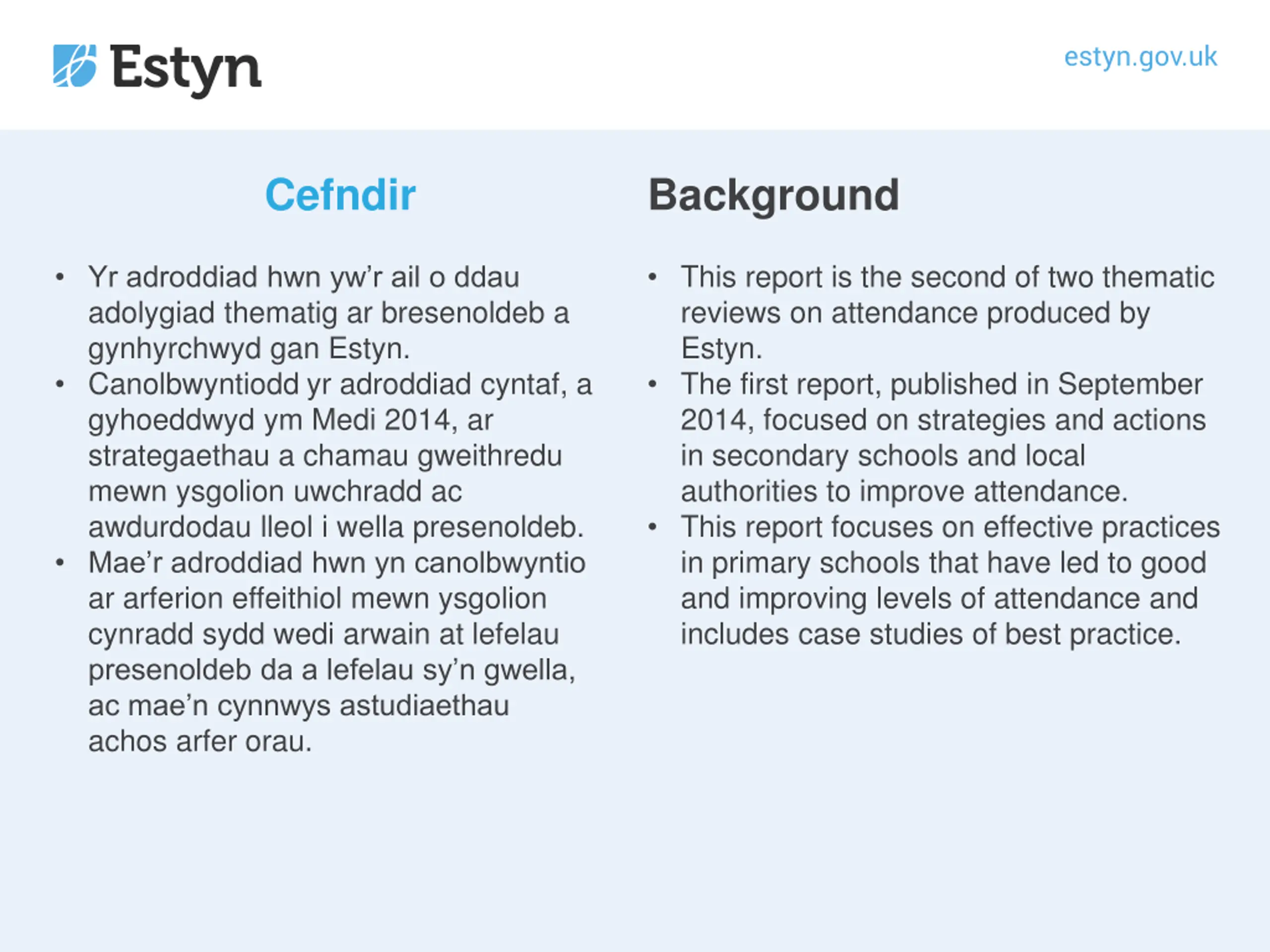 Cefndir Background This report is the second of two thematic reviews on attendance produced by Estyn. The first report, published in September 2014, focused on strategies and actions in secondary schools and local authorities to improve attendance. This report focuses on effective practices in primary schools that have led to good and improving levels of attendance and includes case studies of best practice. Yr adroddiad hwn yw r ail o ddau adolygiad thematig ar bresenoldeb a gynhyrchwyd gan Estyn. Canolbwyntioddyr adroddiad cyntaf, a gyhoeddwyd ym Medi 2014, ar strategaethau a chamau gweithredu mewn ysgolion uwchradd ac awdurdodau lleol i wella presenoldeb. Mae r adroddiad hwn yn canolbwyntio ar arferion effeithiol mewn ysgolion cynradd sydd wedi arwain at lefelau presenoldeb da a lefelau sy n gwella, ac mae n cynnwys astudiaethau achos arfer orau.