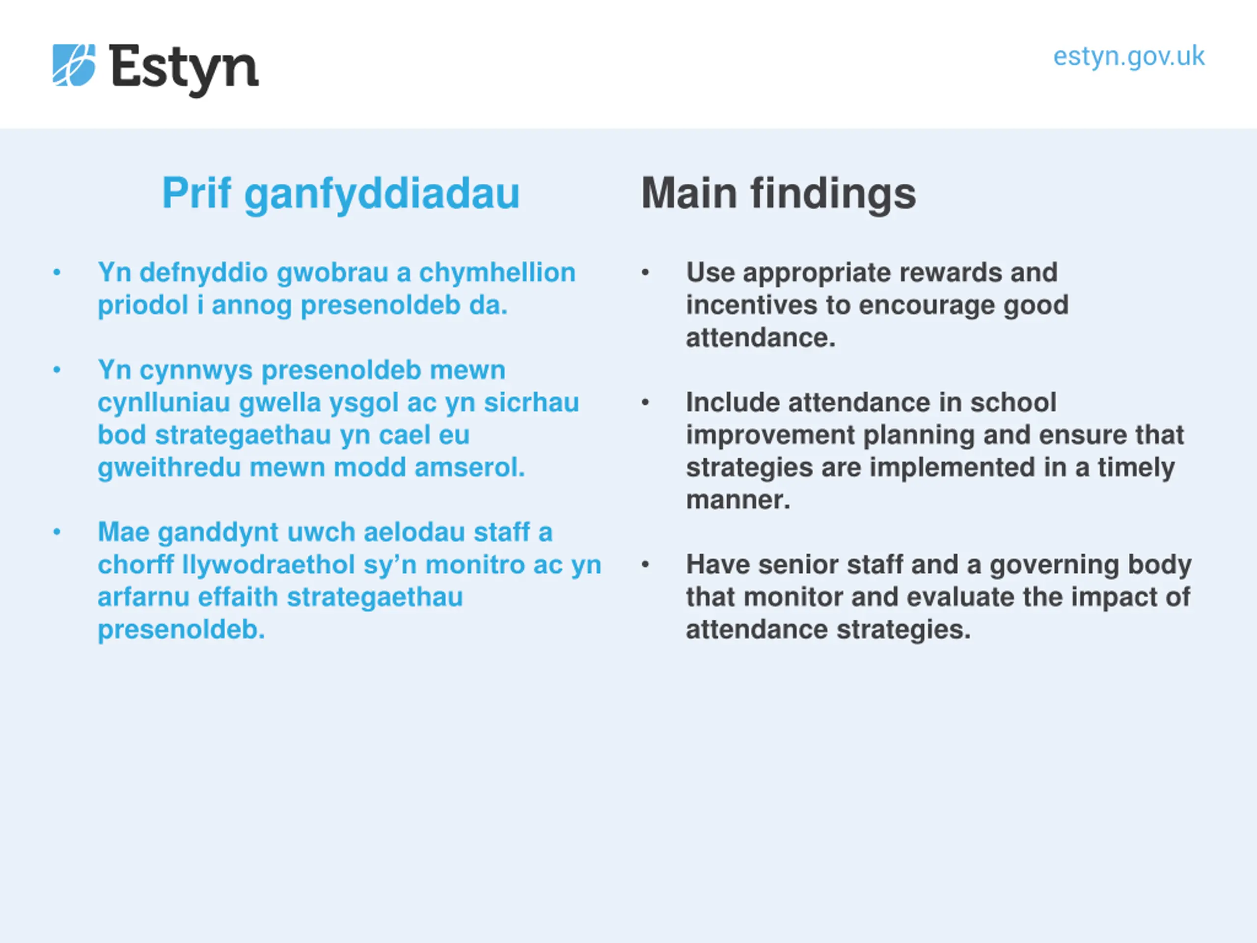 Prif ganfyddiadau Main findings Yn defnyddio gwobrau a chymhellion priodol i annog presenoldeb da. Use appropriate rewards and incentives to encourage good attendance. Yn cynnwys presenoldeb mewn cynlluniau gwella ysgol ac yn sicrhau bod strategaethau yn cael eu gweithredu mewn modd amserol. Include attendance in school improvement planning and ensure that strategies are implemented in a timely manner. Mae ganddynt uwch aelodau staff a chorff llywodraethol sy n monitro ac yn arfarnu effaith strategaethau presenoldeb. Have senior staff and a governing body that monitor and evaluate the impact of attendance strategies.