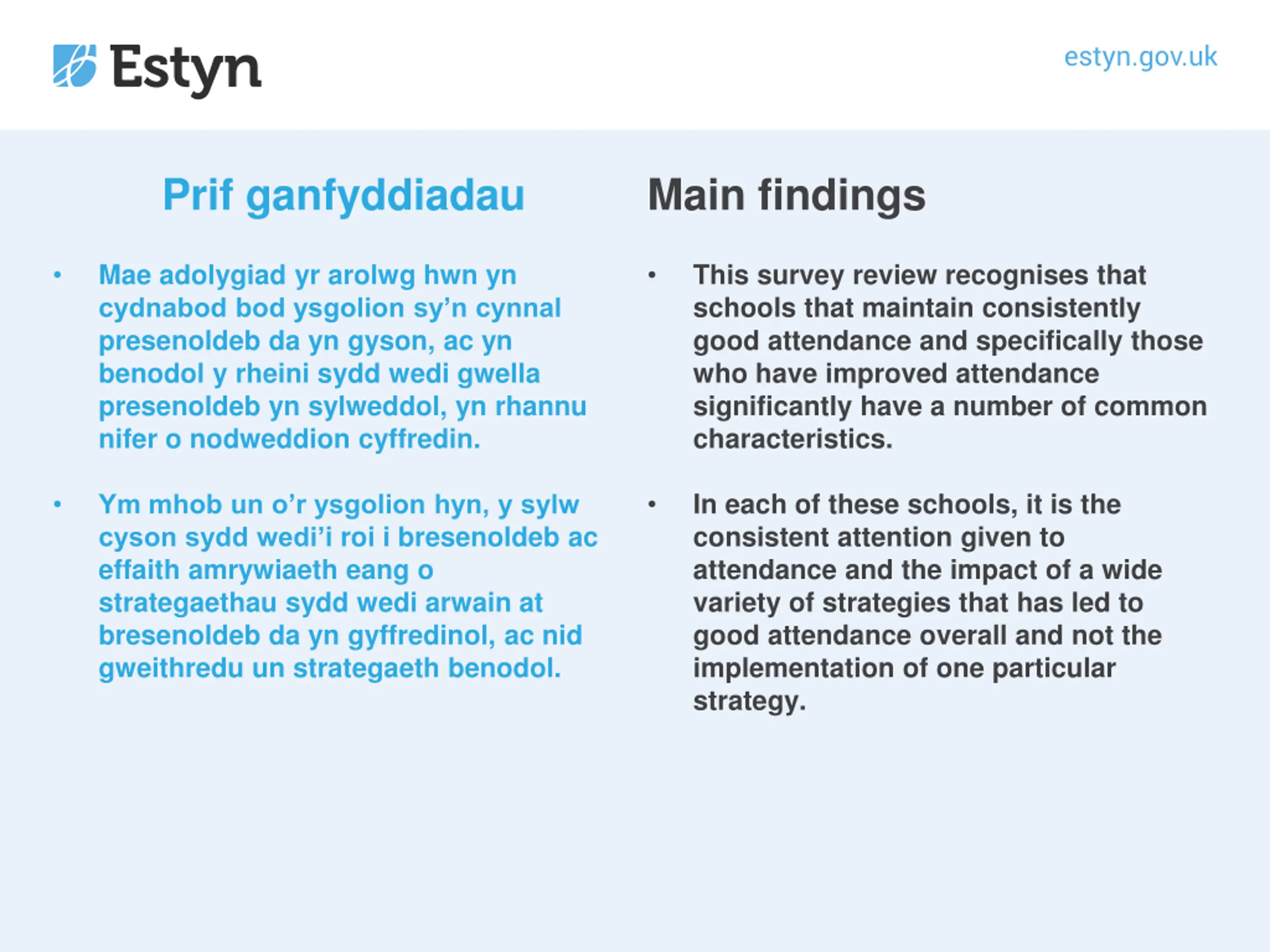 Prif ganfyddiadau Main findings Mae adolygiad yr arolwg hwn yn cydnabod bod ysgolion sy n cynnal presenoldeb da yn gyson, ac yn benodol y rheini sydd wedi gwella presenoldeb yn sylweddol, yn rhannu nifer o nodweddion cyffredin. This survey review recognises that schools that maintain consistently good attendance and specifically those who have improved attendance significantly have a number of common characteristics. In each of these schools, it is the consistent attention given to attendance and the impact of a wide variety of strategies that has led to good attendance overall and not the implementation of one particular strategy. Ym mhob un o r ysgolion hyn, y sylw cyson sydd wedi i roi i bresenoldeb ac effaith amrywiaeth eang o strategaethau sydd wedi arwain at bresenoldeb da yn gyffredinol, ac nid gweithredu un strategaeth benodol.