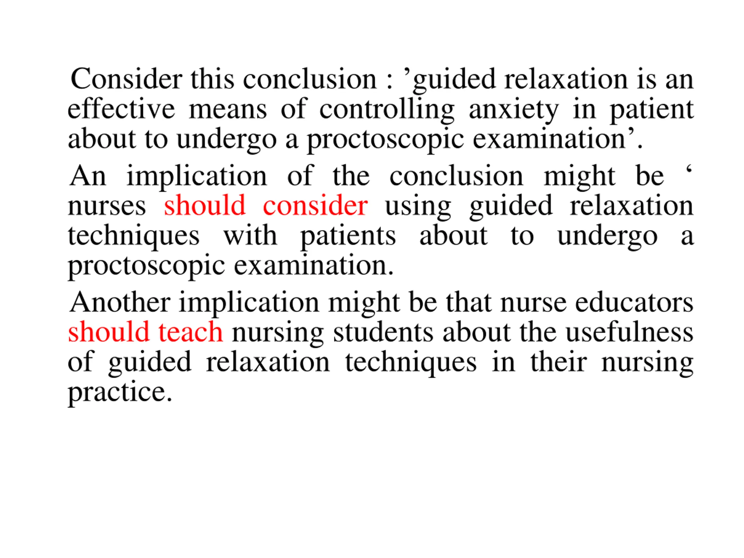 Consider this conclusion : guided relaxation is an effective means of controlling anxiety in patient about to undergo a proctoscopic examination . An implication of the conclusion might be nurses should consider using guided relaxation techniques with patients about to undergo a proctoscopic examination. Another implication might be that nurse educators should teach nursing students about the usefulness of guided relaxation techniques in their nursing practice.