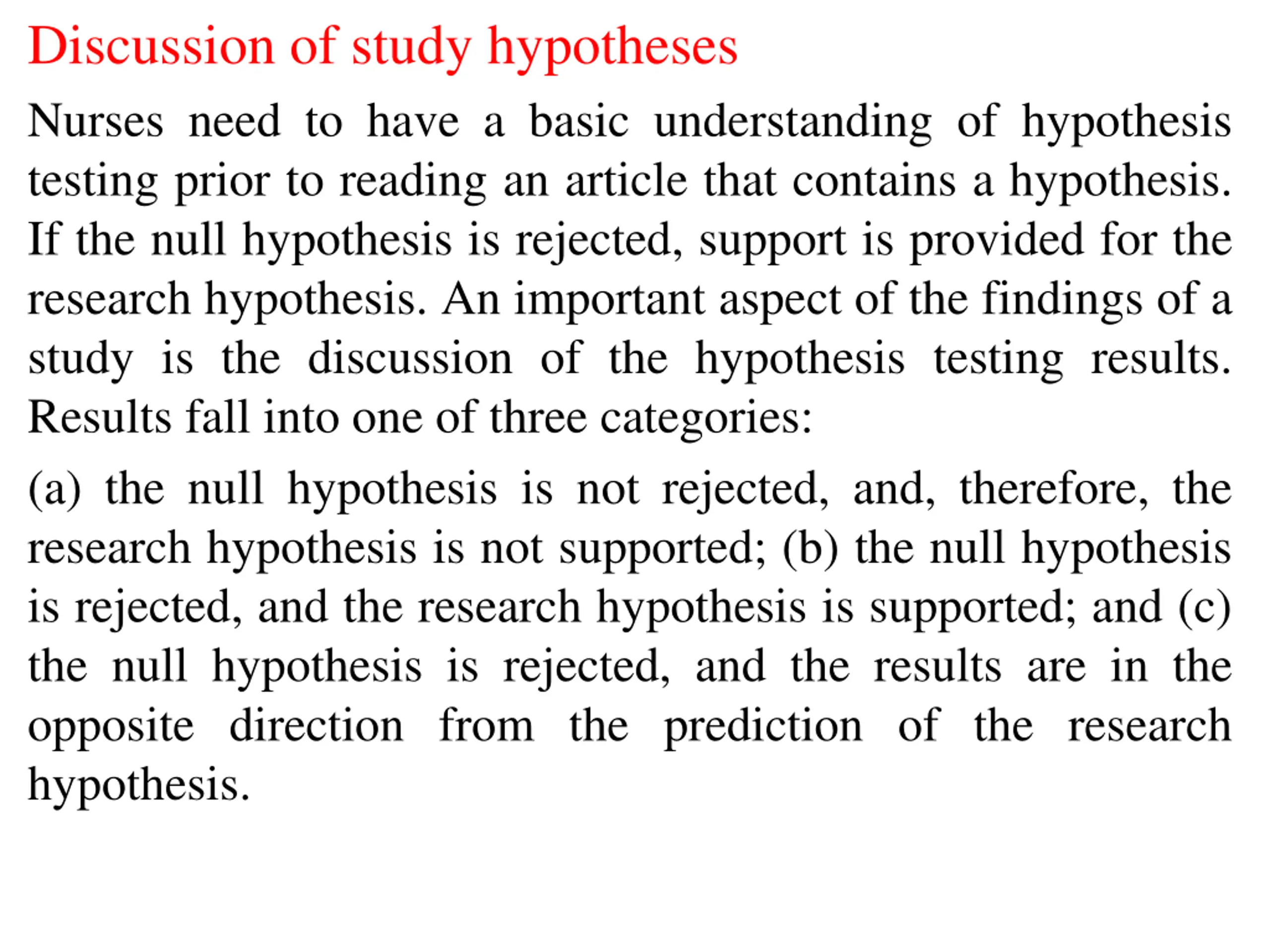 Discussion of study hypotheses Nurses need to have a basic understanding of hypothesis testing prior to reading an article that contains a hypothesis. If the null hypothesis is rejected, support is provided for the research hypothesis. An important aspect of the findings of a study is the discussion of the hypothesis testing results. Results fall into one of three categories: (a) the null hypothesis is not rejected, and, therefore, the research hypothesis is not supported; (b) the null hypothesis is rejected, and the research hypothesis is supported; and (c) the null hypothesis is rejected, and the results are in the opposite direction from the prediction of the research hypothesis.