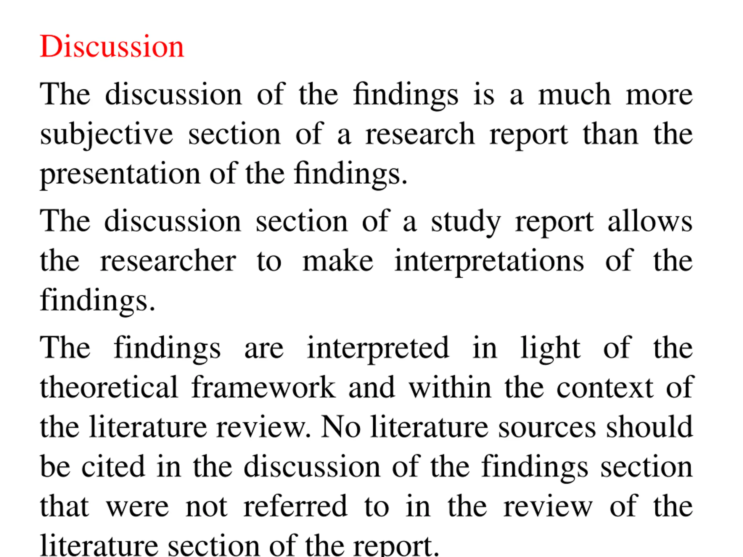 Discussion The discussion of the findings is a much more subjective section of a research report than the presentation of the findings. The discussion section of a study report allows the researcher to make interpretations of the findings. The findings are interpreted in light of the theoretical framework and within the context of the literature review. No literature sources should be cited in the discussion of the findings section that were not referred to in the review of the literature section of the report.