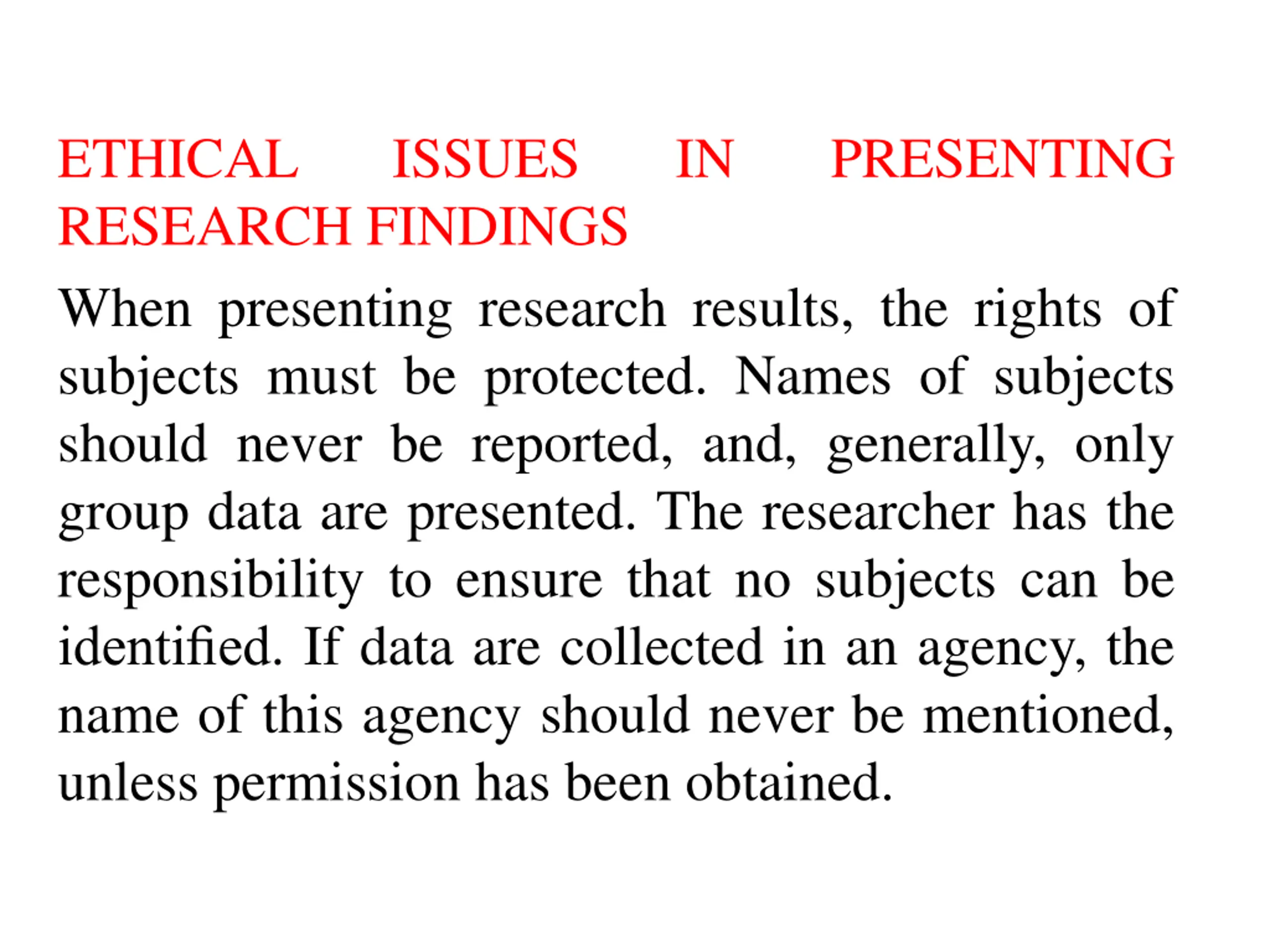 ETHICAL RESEARCH FINDINGS When presenting research results, the rights of subjects must be protected. Names of subjects should never be reported, and, generally, only group data are presented. The researcher has the responsibility to ensure that no subjects can be identified. If data are collected in an agency, the name of this agency should never be mentioned, unless permission has been obtained. ISSUES IN PRESENTING
