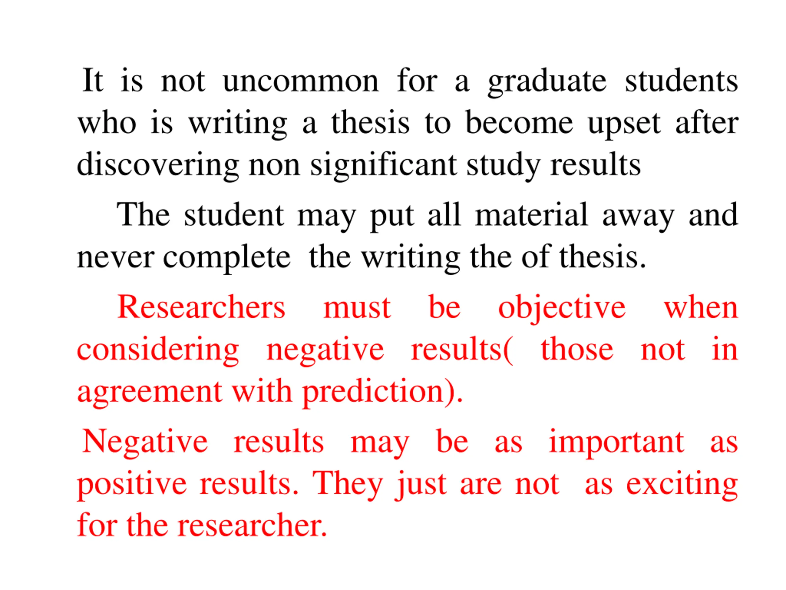 It is not uncommon for a graduate students who is writing a thesis to become upset after discovering non significant study results The student may put all material away and never complete the writing the of thesis. Researchers must considering negative results( those not in agreement with prediction). Negative results may be as important as positive results. They just are not as exciting for the researcher. be objective when