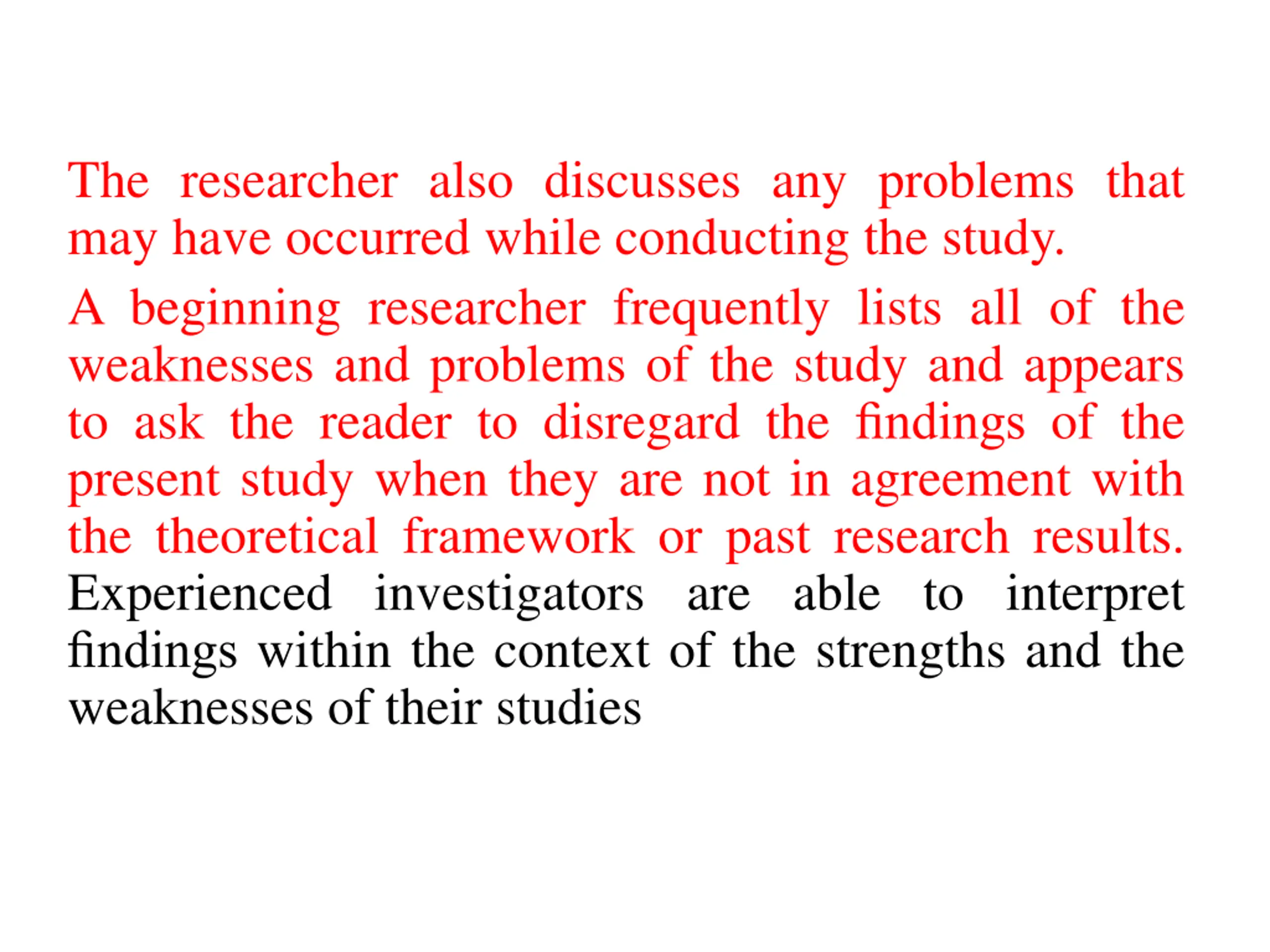 The researcher also discusses any problems that may have occurred while conducting the study. A beginning researcher frequently lists all of the weaknesses and problems of the study and appears to ask the reader to disregard the findings of the present study when they are not in agreement with the theoretical framework or past research results. Experienced investigators are able to interpret findings within the context of the strengths and the weaknesses of their studies