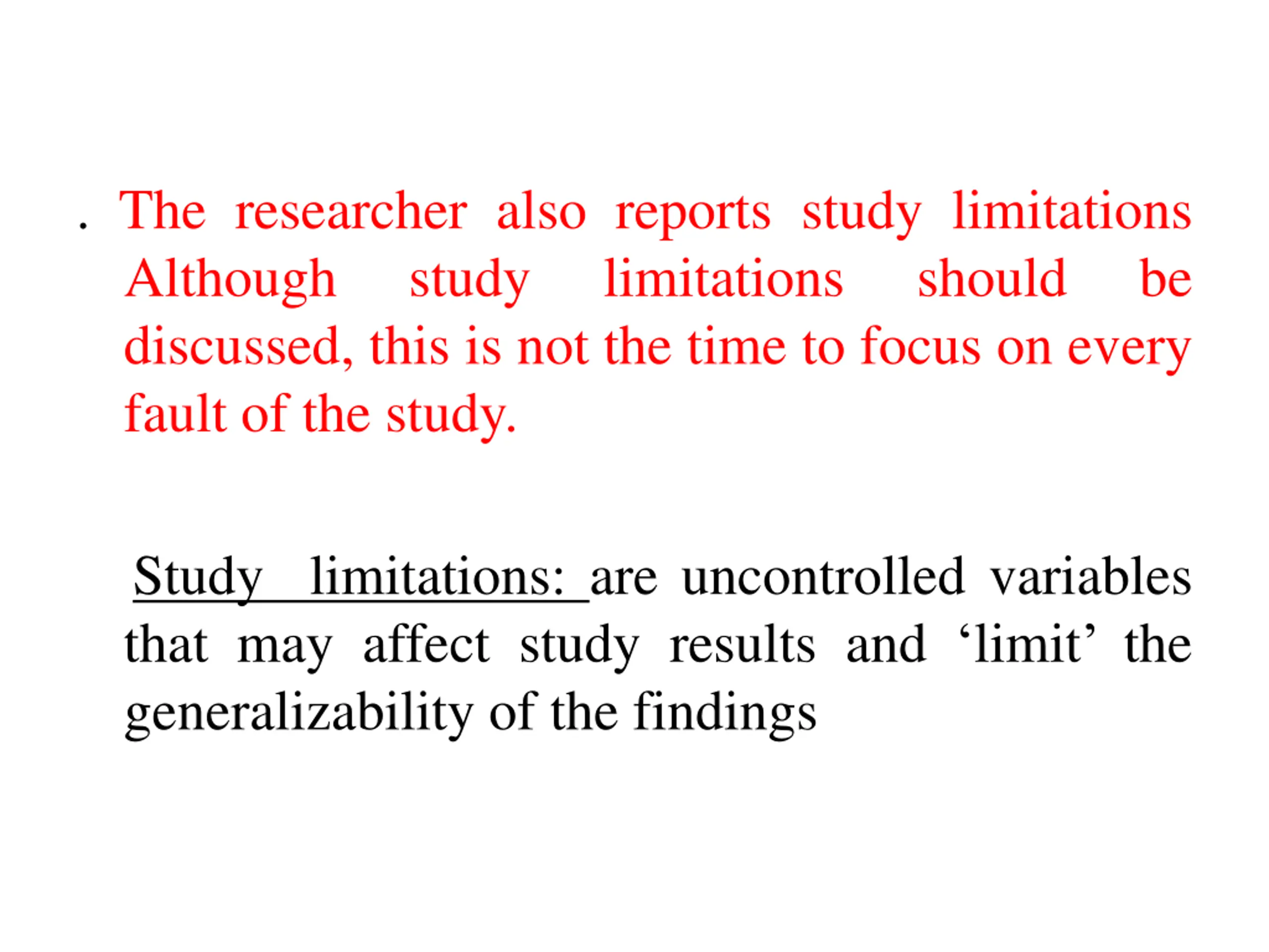 . The researcher also reports study limitations Although study limitations discussed, this is not the time to focus on every fault of the study. should be Study limitations: are uncontrolled variables that may affect study results and limit the generalizability of the findings