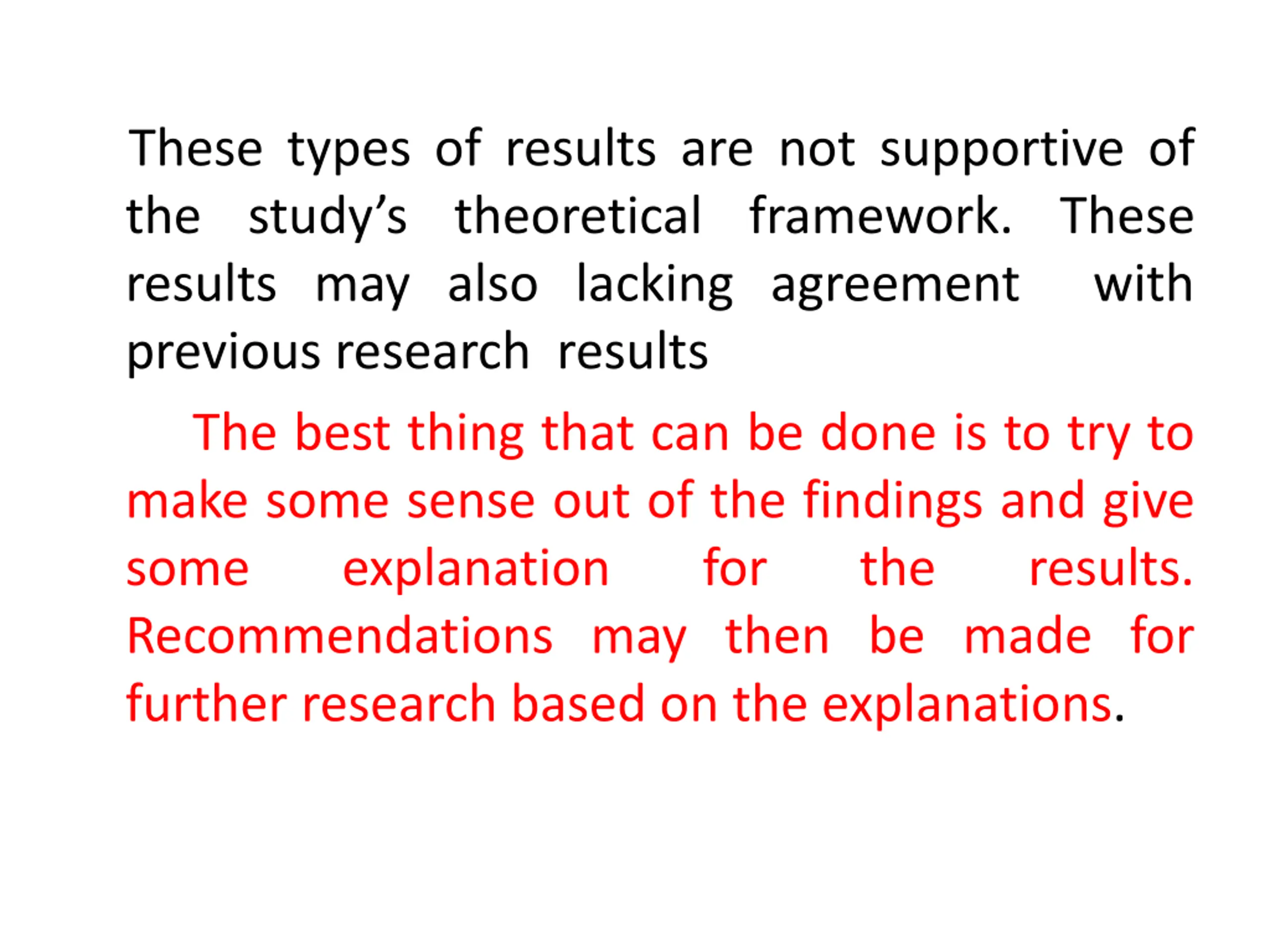 These types of results are not supportive of the study s theoretical framework. These results may also lacking agreement previous research results The best thing that can be done is to try to make some sense out of the findings and give some explanation Recommendations may then be made for further research based on the explanations. with for the results.