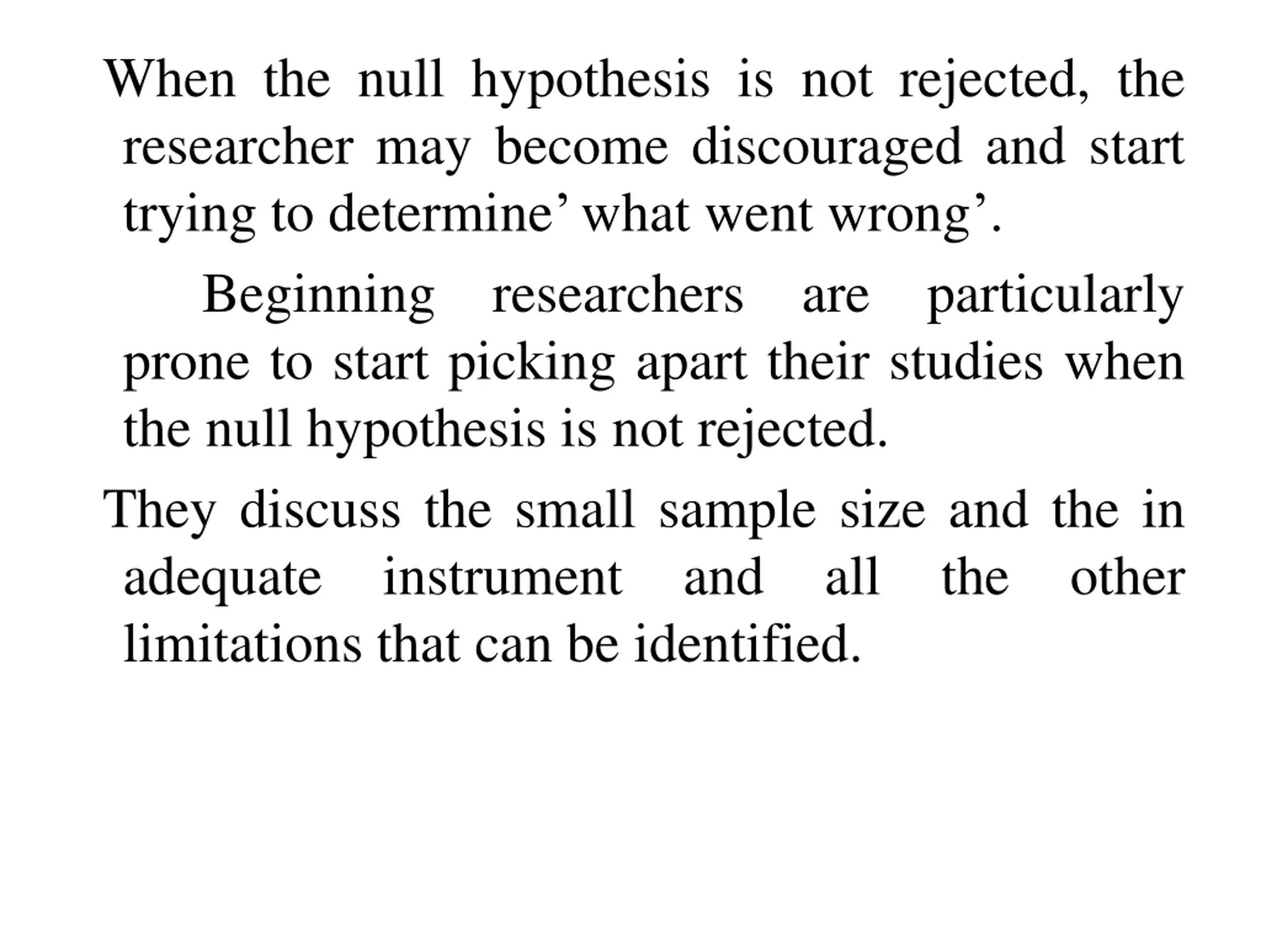 When the null hypothesis is not rejected, the researcher may become discouraged and start trying to determine what went wrong . Beginning researchers prone to start picking apart their studies when the null hypothesis is not rejected. They discuss the small sample size and the in adequate instrument limitations that can be identified. are particularly and all the other