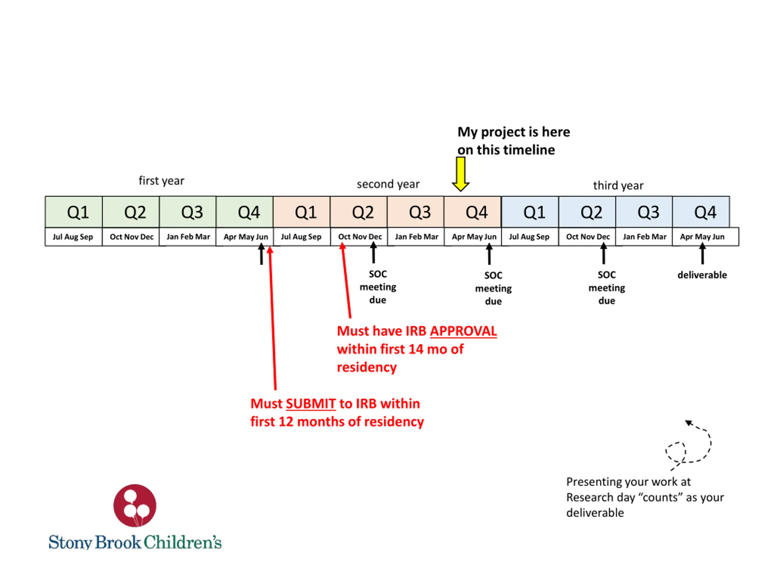My project is here on this timeline first year second year third year Q3 Q3 Q3 Q1 Q2 Q4 Q1 Q2 Q4 Q1 Q2 Q4 Jan Feb Mar Jan Feb Mar Jan Feb Mar Jul Aug Sep Oct Nov Dec Apr May Jun Jul Aug Sep Oct Nov Dec Apr May Jun Jul Aug Sep Oct Nov Dec Apr May Jun SOC meeting due SOC meeting due deliverable SOC meeting due Must have IRB APPROVAL within first 14 mo of residency Must SUBMIT to IRB within first 12 months of residency Presenting your work at Research day counts as your deliverable