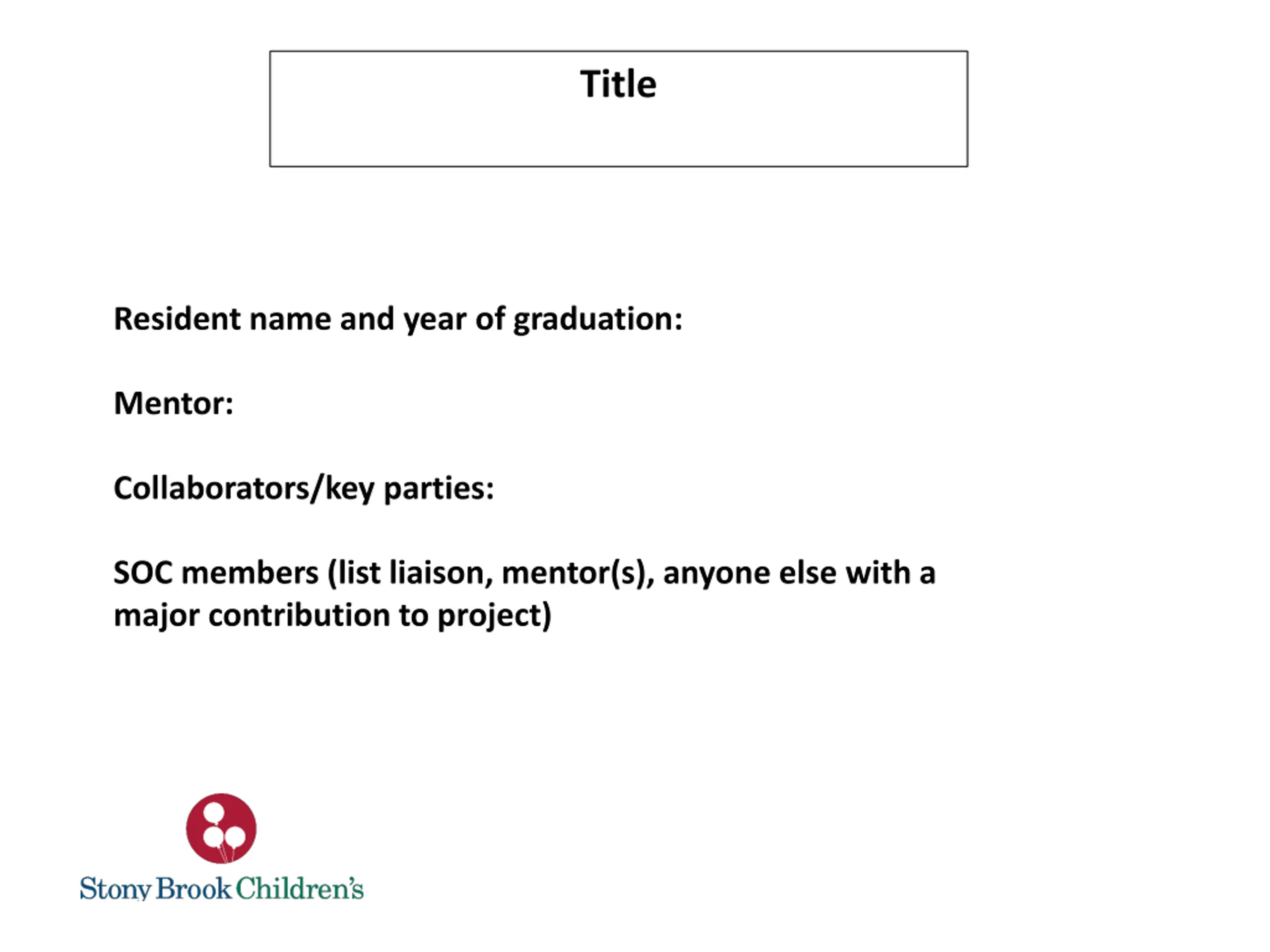 Title Resident name and year of graduation: Mentor: Collaborators/key parties: SOC members (list liaison, mentor(s), anyone else with a major contribution to project)