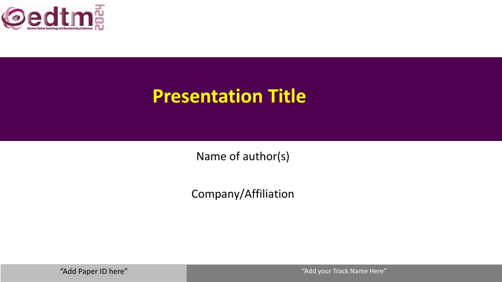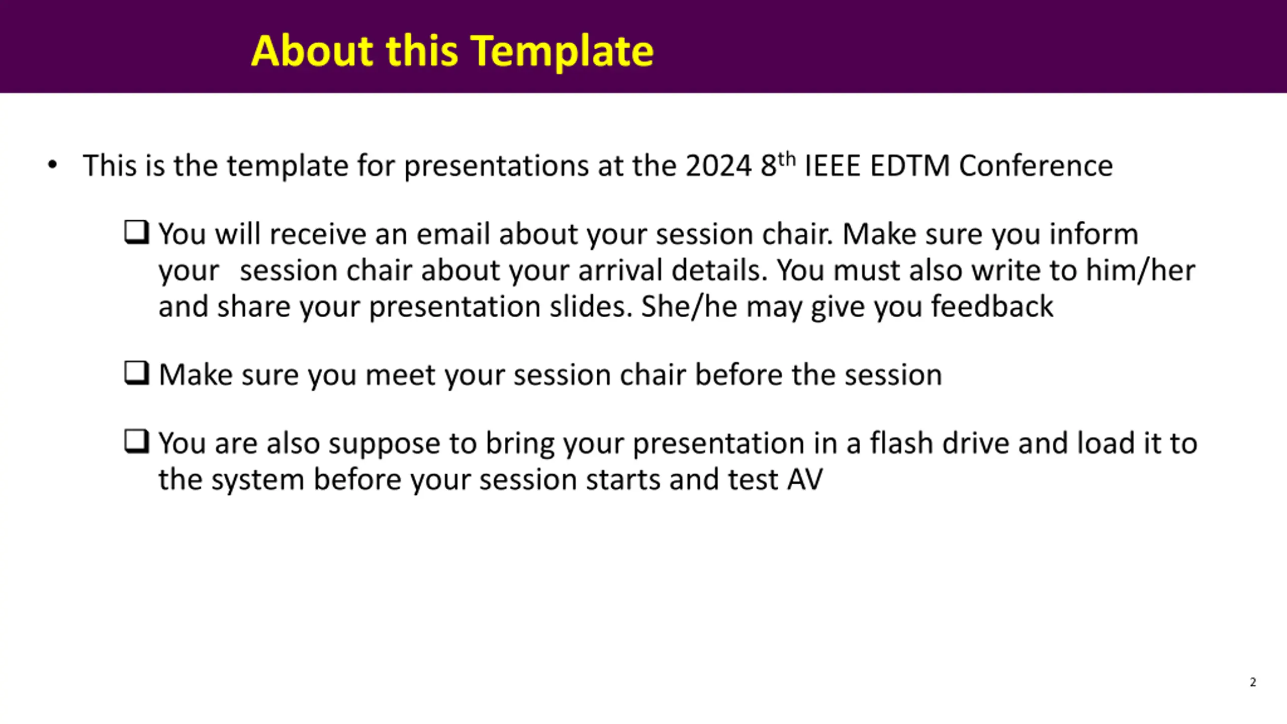 About this Template This is the template for presentations at the 2024 8th IEEE EDTM Conference You will receive an email about your session chair. Make sure you inform your session chair about your arrival details. You must also write to him/her and share your presentation slides. She/he may give you feedback Make sure you meet your session chair before the session You are also suppose to bring your presentation in a flash drive and load it to the system before your session starts and test AV 2