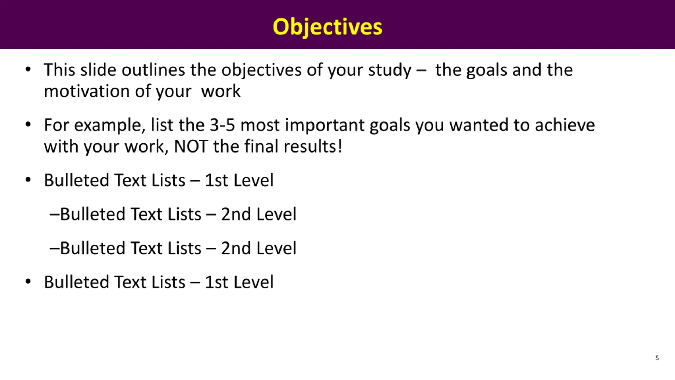 Objectives This slide outlines the objectives of your study the goals and the motivation of your work For example, list the 3-5 most important goals you wanted to achieve with your work, NOT the final results! Bulleted Text Lists 1st Level Bulleted Text Lists 2nd Level Bulleted Text Lists 2nd Level Bulleted Text Lists 1st Level 5