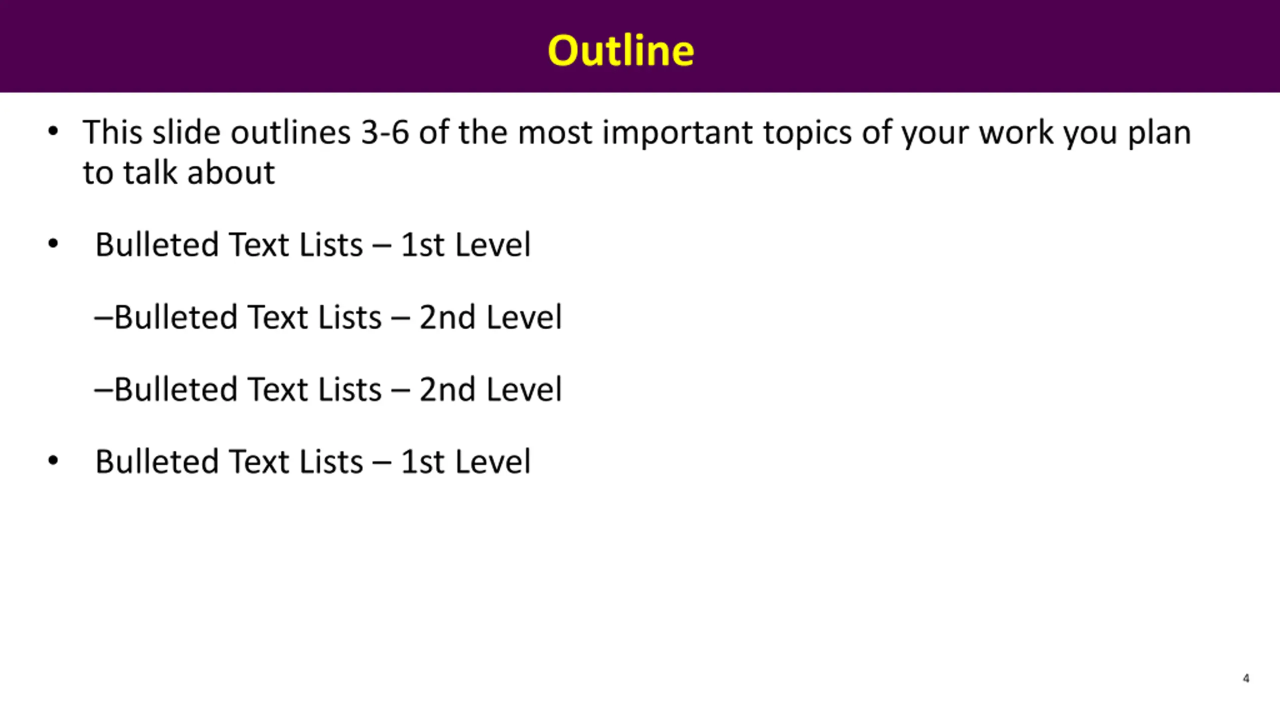 Outline This slide outlines 3-6 of the most important topics of your work you plan to talk about Bulleted Text Lists 1st Level Bulleted Text Lists 2nd Level Bulleted Text Lists 2nd Level Bulleted Text Lists 1st Level 4