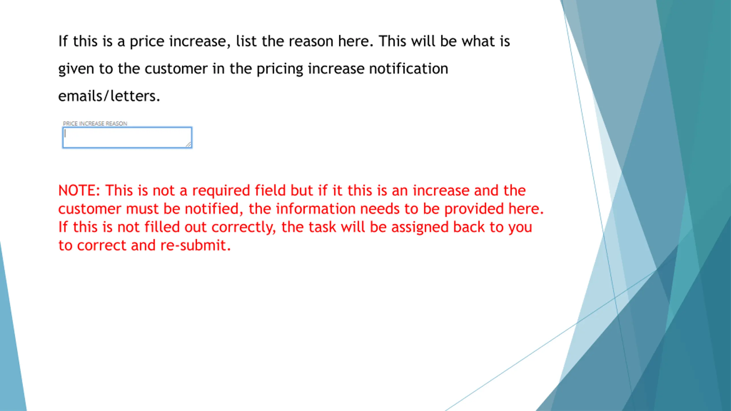 If this is a price increase, list the reason here. This will be what is given to the customer in the pricing increase notification emails/letters. NOTE: This is not a required field but if it this is an increase and the customer must be notified, the information needs to be provided here. If this is not filled out correctly, the task will be assigned back to you to correct and re-submit.