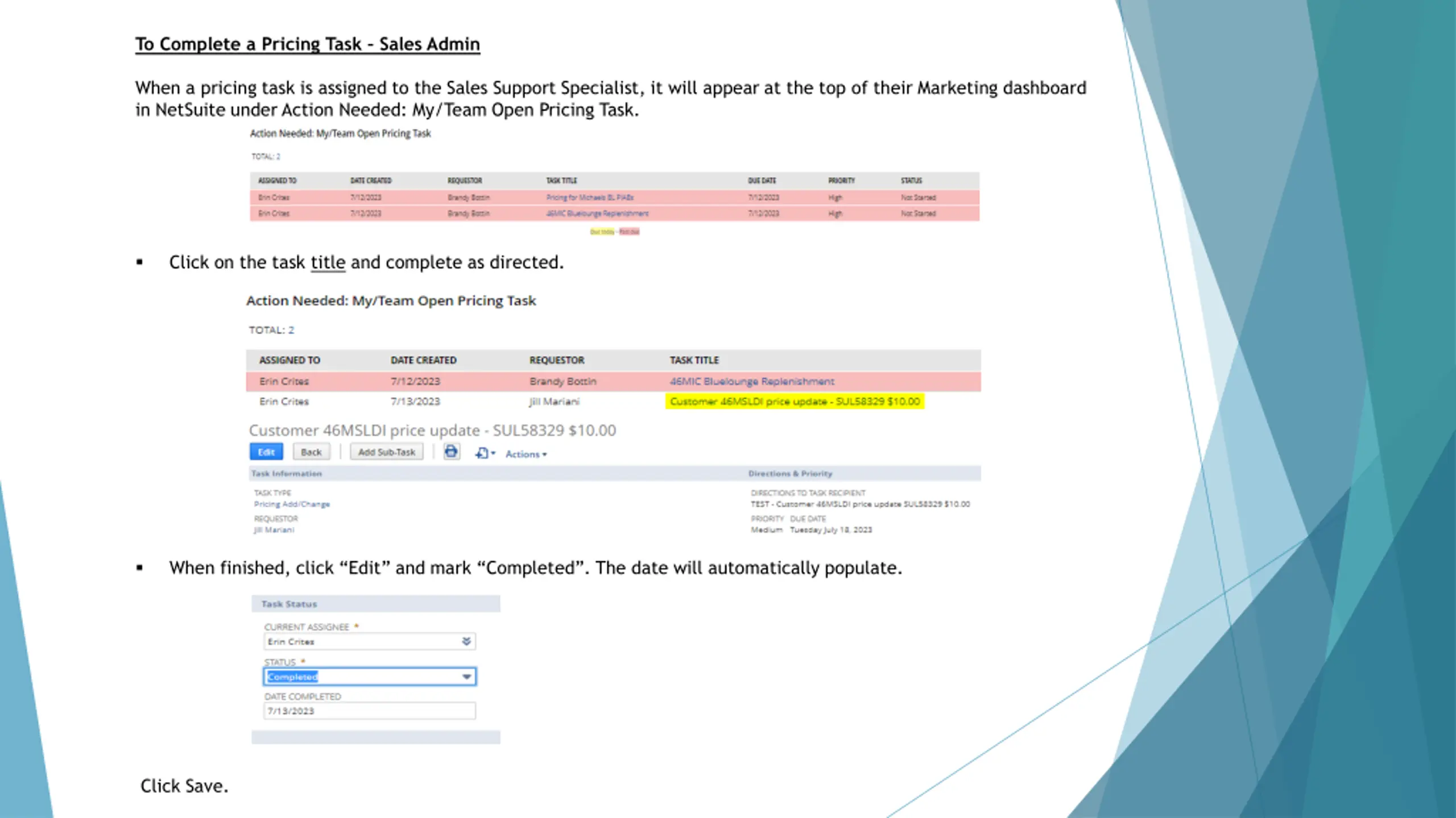 To Complete a Pricing Task Sales Admin When a pricing task is assigned to the Sales Support Specialist, it will appear at the top of their Marketing dashboard in NetSuite under Action Needed: My/Team Open Pricing Task. Click on the task title and complete as directed. When finished, click Edit and mark Completed . The date will automatically populate. Click Save.