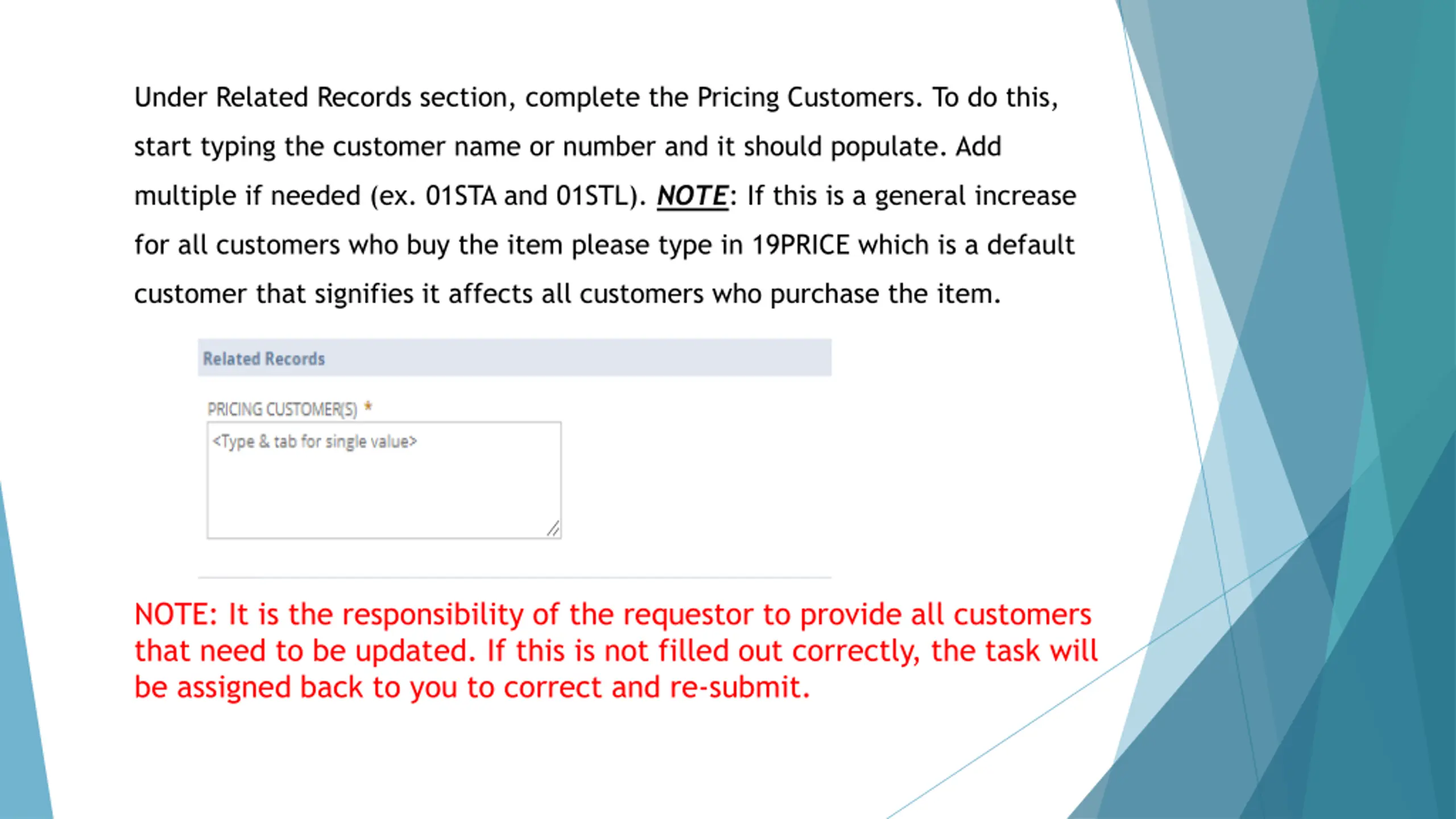 Under Related Records section, complete the Pricing Customers. To do this, start typing the customer name or number and it should populate. Add multiple if needed (ex. 01STA and 01STL). NOTE: If this is a general increase for all customers who buy the item please type in 19PRICE which is a default customer that signifies it affects all customers who purchase the item. NOTE: It is the responsibility of the requestor to provide all customers that need to be updated. If this is not filled out correctly, the task will be assigned back to you to correct and re-submit.