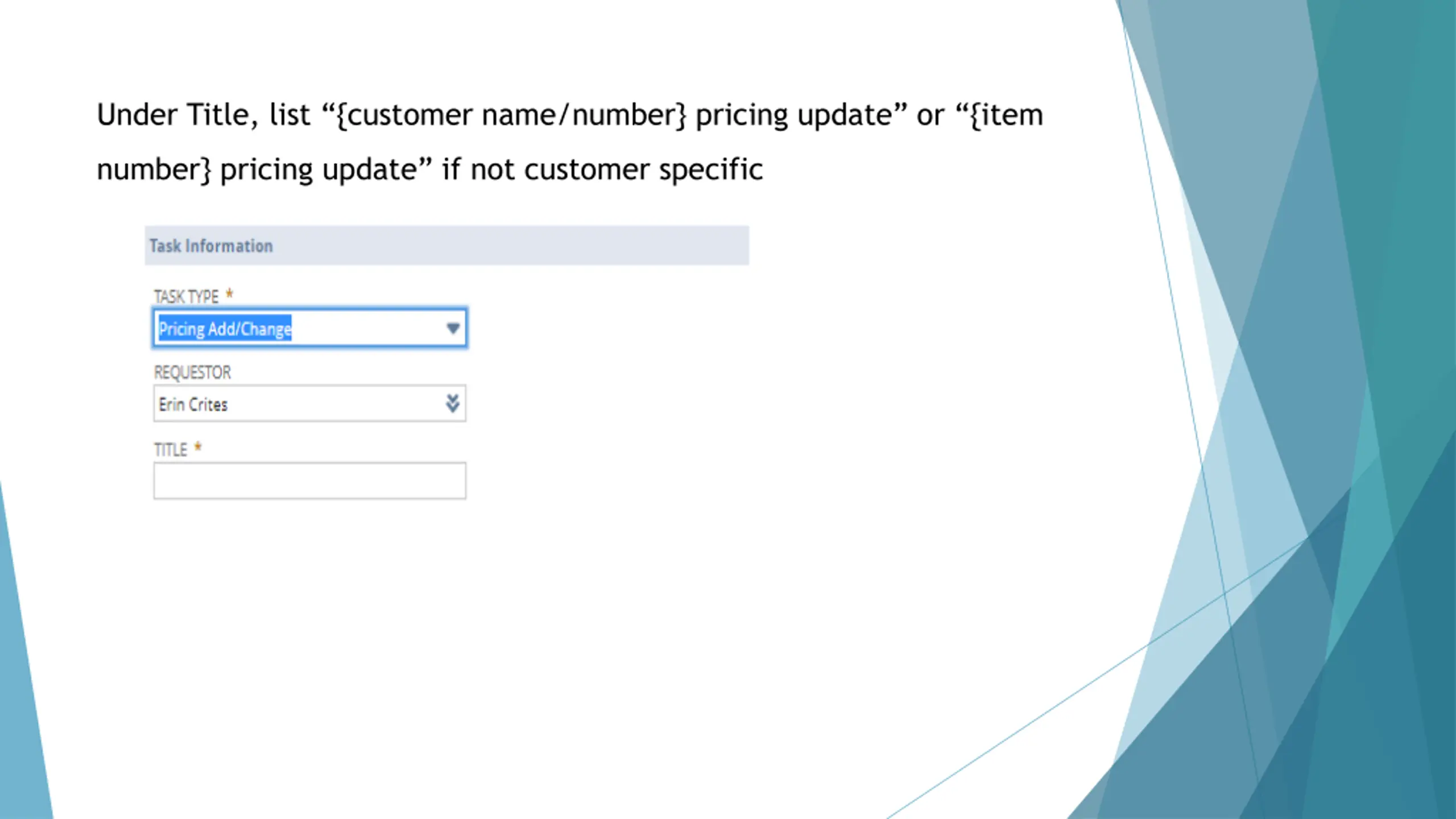 Under Title, list {customer name/number} pricing update or {item number} pricing update if not customer specific