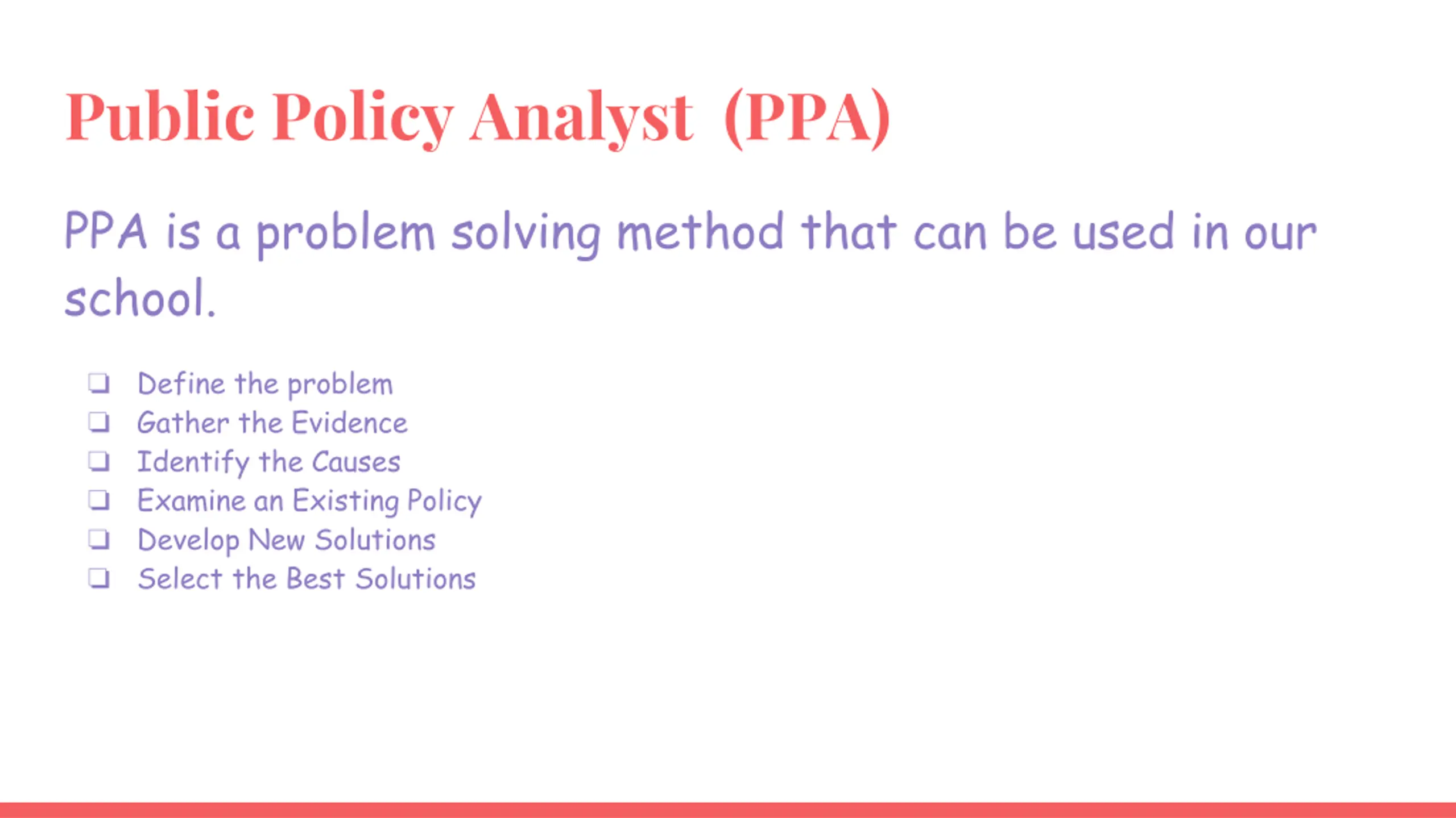 Public Policy Analyst (PPA) PPA is a problem solving method that can be used in our school. Define the problem Gather the Evidence Identify the Causes Examine an Existing Policy Develop New Solutions Select the Best Solutions