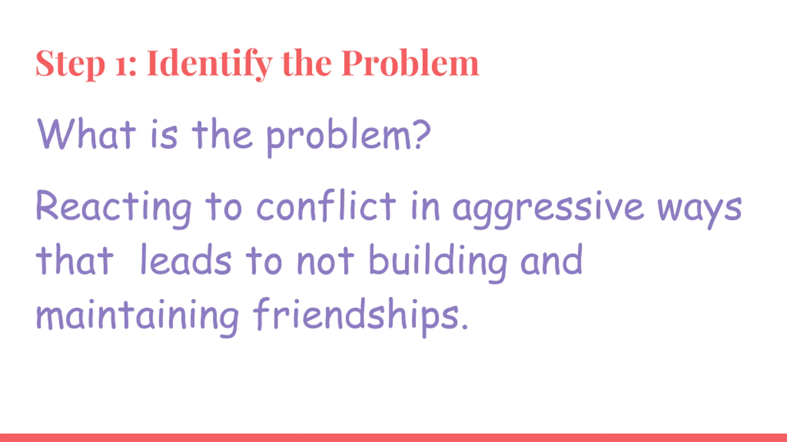 Step 1: Identify the Problem What is the problem? Reacting to conflict in aggressive ways that leads to not building and maintaining friendships.