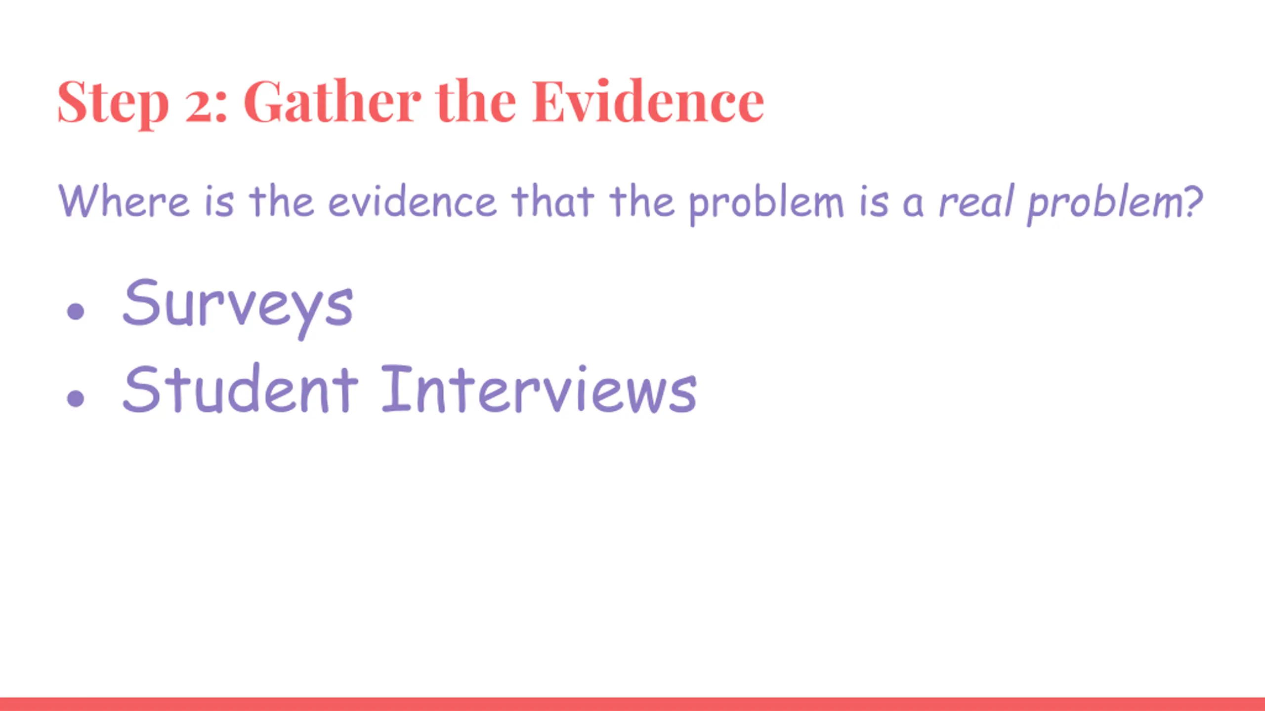 Step 2: Gather the Evidence Where is the evidence that the problem is a real problem? Surveys Student Interviews