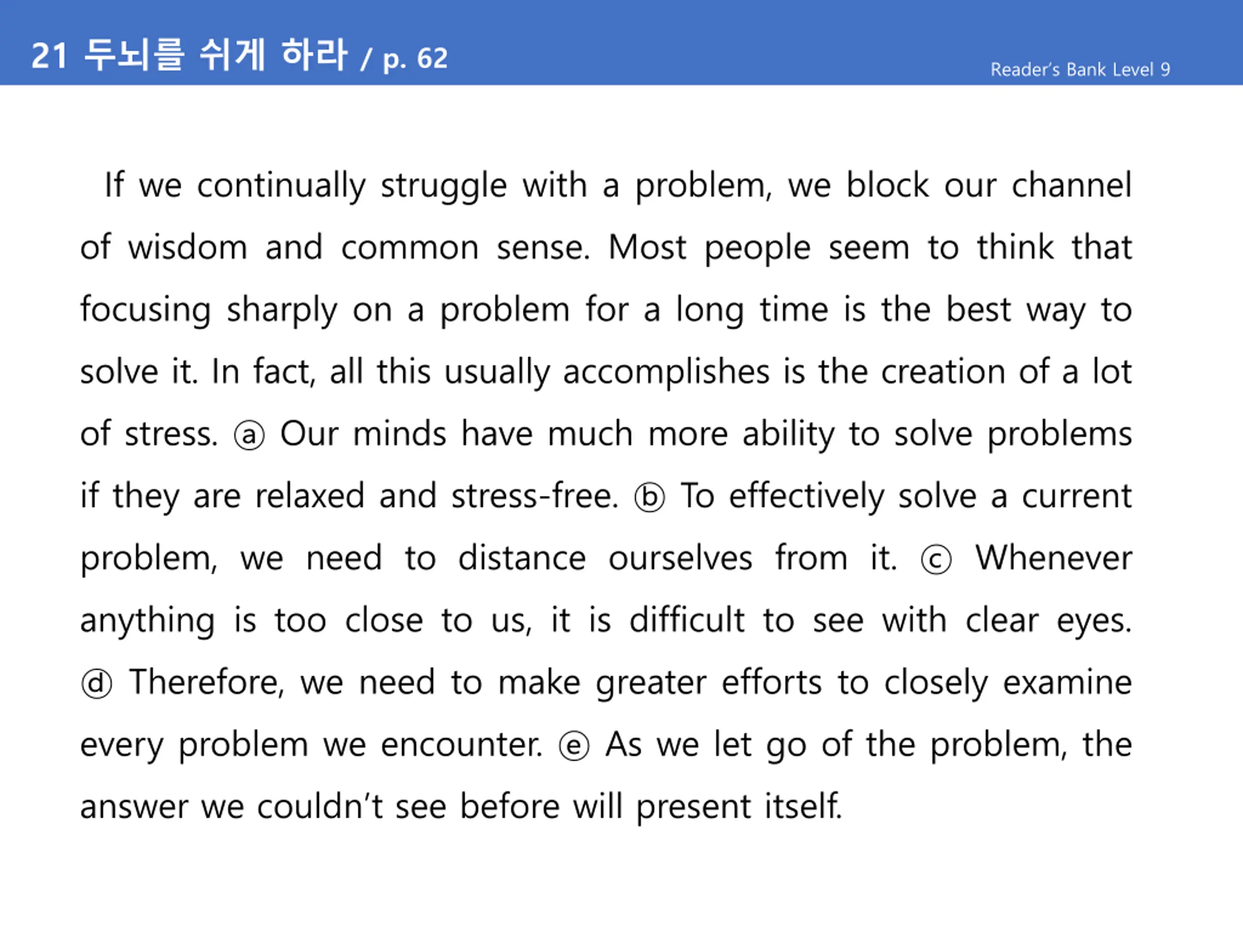 21 / p. 62 Reader s Bank Level 9 If we continually struggle with a problem, we block our channel of wisdom and common sense. Most people seem to think that focusing sharply on a problem for a long time is the best way to solve it. In fact, all this usually accomplishes is the creation of a lot of stress. Our minds have much more ability to solve problems if they are relaxed and stress-free. To effectively solve a current problem, we need to distance ourselves from it. Whenever anything is too close to us, it is difficult to see with clear eyes. Therefore, we need to make greater efforts to closely examine every problem we encounter. As we let go of the problem, the answer we couldn t see before will present itself.