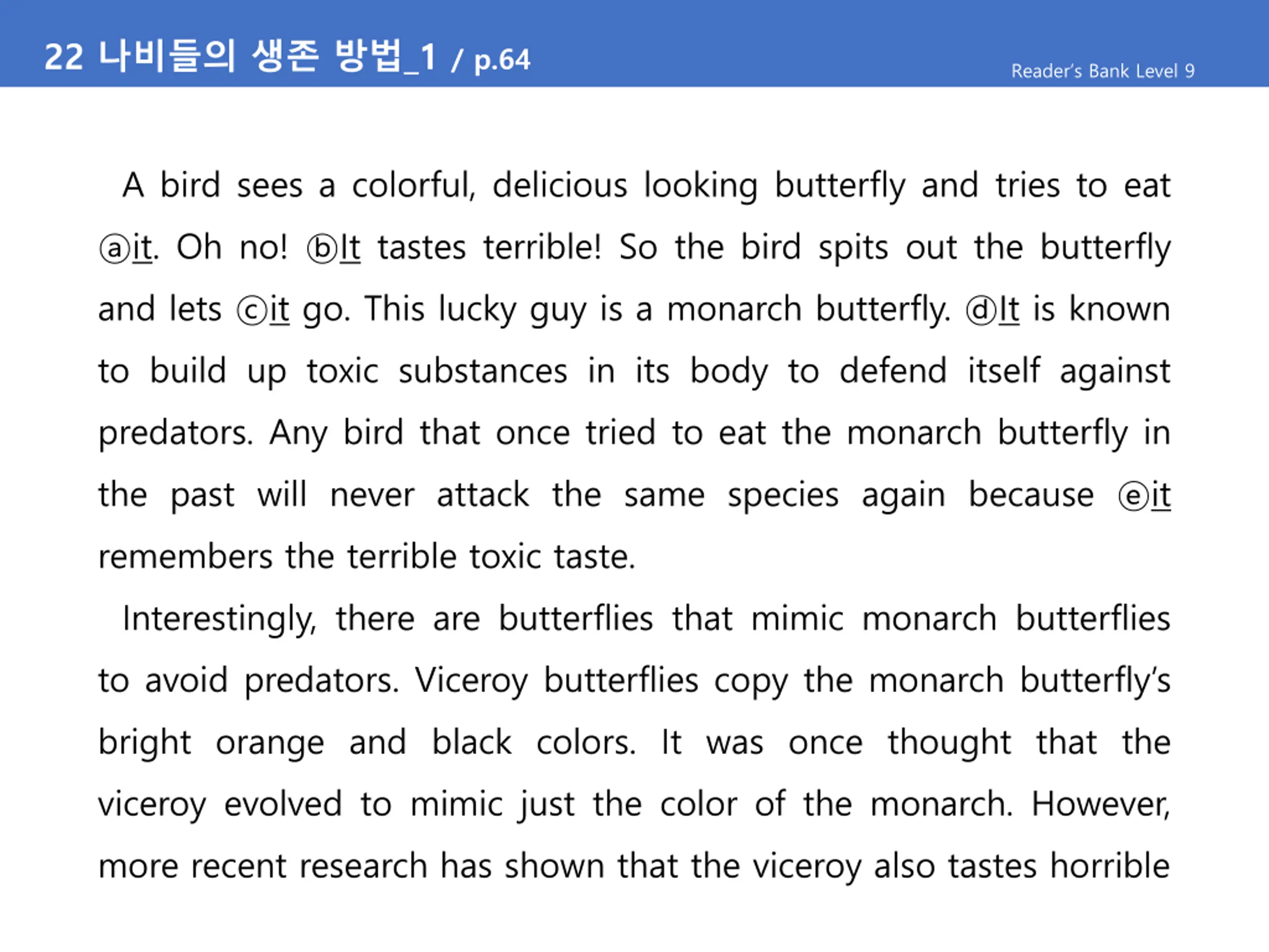 22 _1 / p.64 Reader s Bank Level 9 A bird sees a colorful, delicious looking butterfly and tries to eat it. Oh no! It tastes terrible! So the bird spits out the butterfly and lets it go. This lucky guy is a monarch butterfly. It is known to build up toxic substances in its body to defend itself against predators. Any bird that once tried to eat the monarch butterfly in the past will never attack the same species again because it remembers the terrible toxic taste. Interestingly, there are butterflies that mimic monarch butterflies to avoid predators. Viceroy butterflies copy the monarch butterfly s bright orange and black colors. It was once thought that the viceroy evolved to mimic just the color of the monarch. However, more recent research has shown that the viceroy also tastes horrible