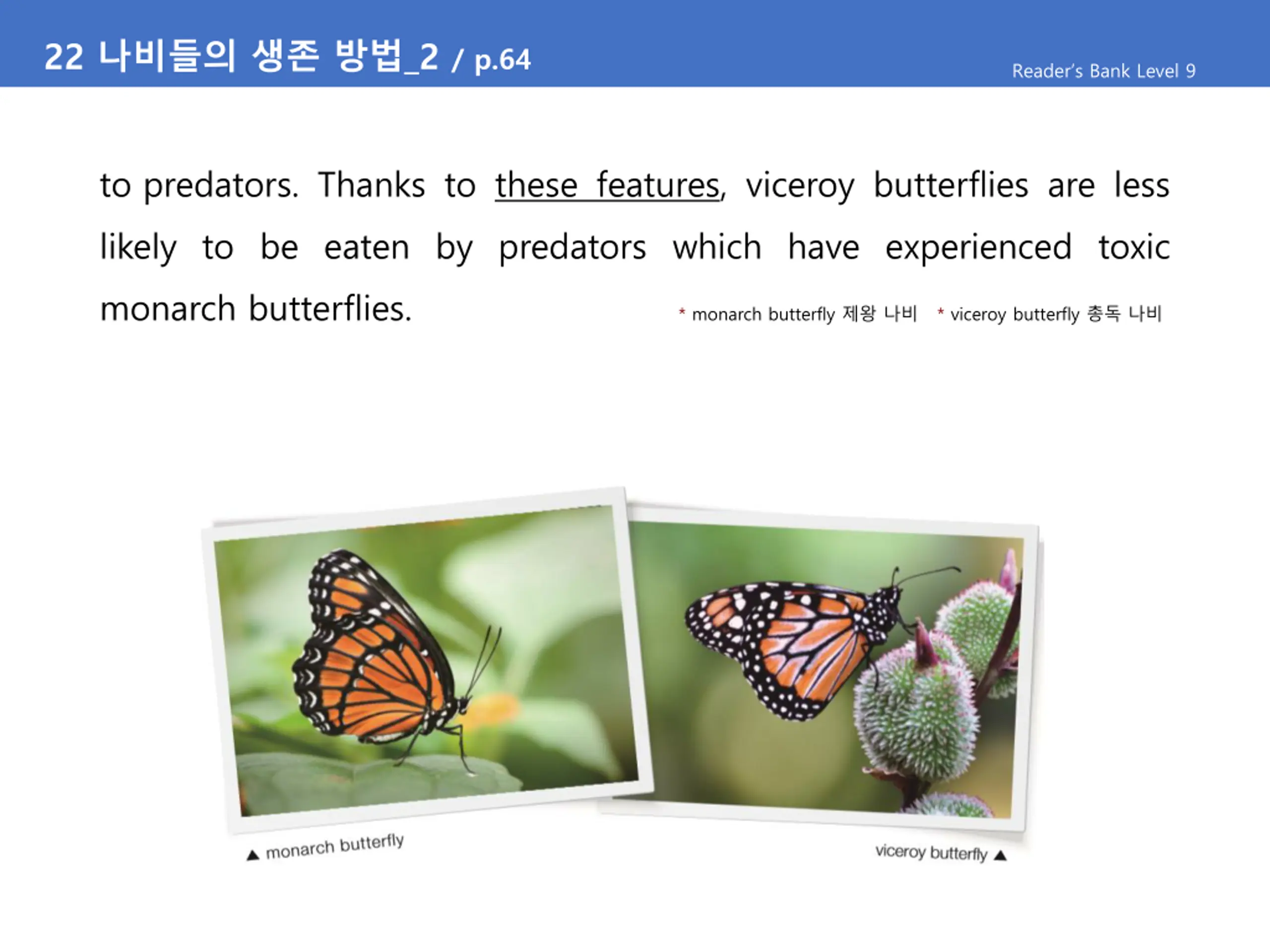 22 _2 / p.64 Reader s Bank Level 9 topredators. Thanks to these features, viceroy butterflies are less likely to be eaten by predators which have experienced toxic monarch butterflies. * monarch butterfly * viceroy butterfly