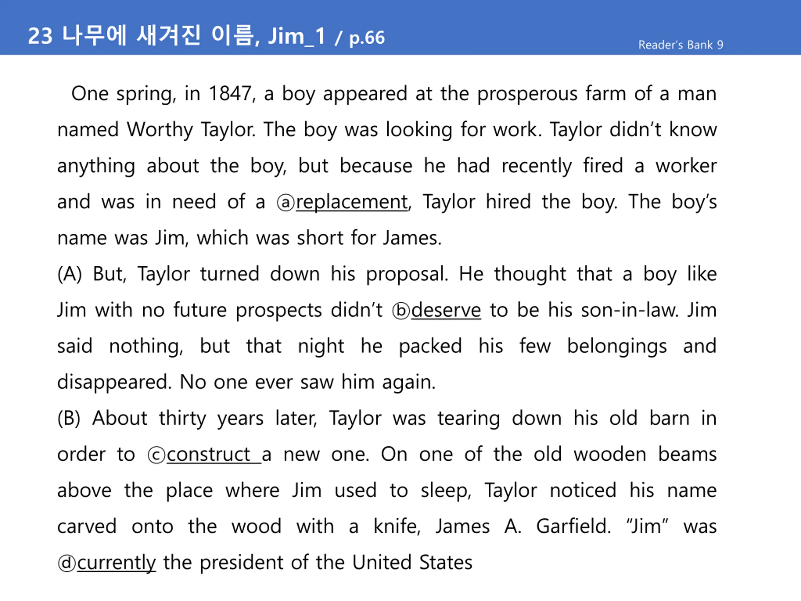 23 , Jim_1 / p.66 Reader s Bank 9 One spring, in 1847, a boy appeared at the prosperous farm of a man named Worthy Taylor. The boy was looking for work. Taylor didn t know anything about the boy, but because he had recently fired a worker and was in need of a replacement, Taylor hired the boy. The boy s name was Jim, which was short for James. (A) But, Taylor turned down his proposal. He thought that a boy like Jim with no future prospects didn t deserve to be his son-in-law. Jim said nothing, but that night he packed his few belongings and disappeared. No one ever saw him again. (B) About thirty years later, Taylor was tearing down his old barn in order to construct a new one. On one of the old wooden beams above the place where Jim used to sleep, Taylor noticed his name carved onto the wood with a knife, James A. Garfield. Jim was currently the president of the United States