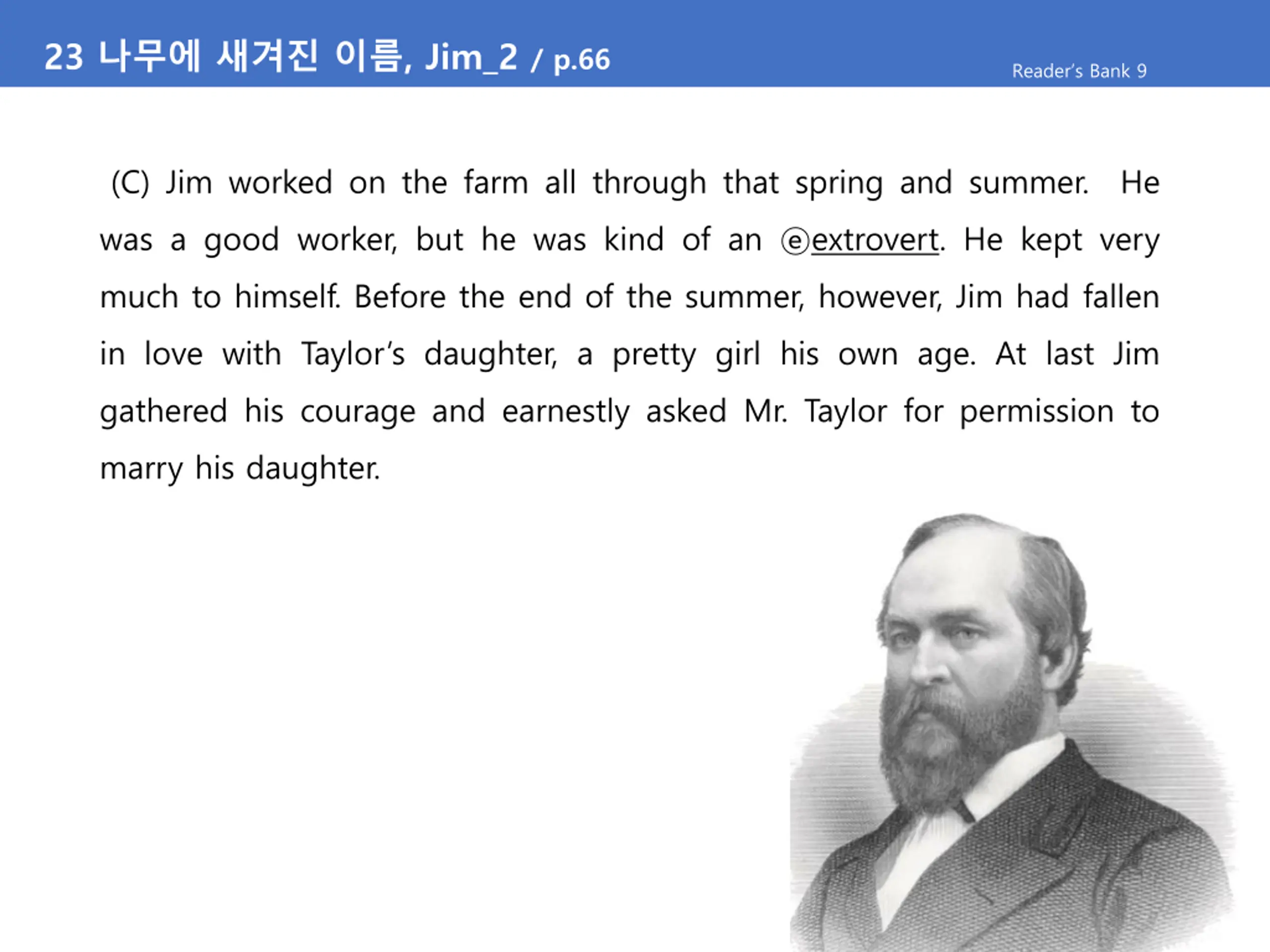 23 , Jim_2 / p.66 Reader s Bank 9 (C) Jim worked on the farm all through that spring and summer. was a good worker, but he was kind of an extrovert. He kept very much to himself. Before the end of the summer, however, Jim had fallen in love with Taylor s daughter, a pretty girl his own age. At last Jim gathered his courage and earnestly asked Mr. Taylor for permission to marry his daughter. He