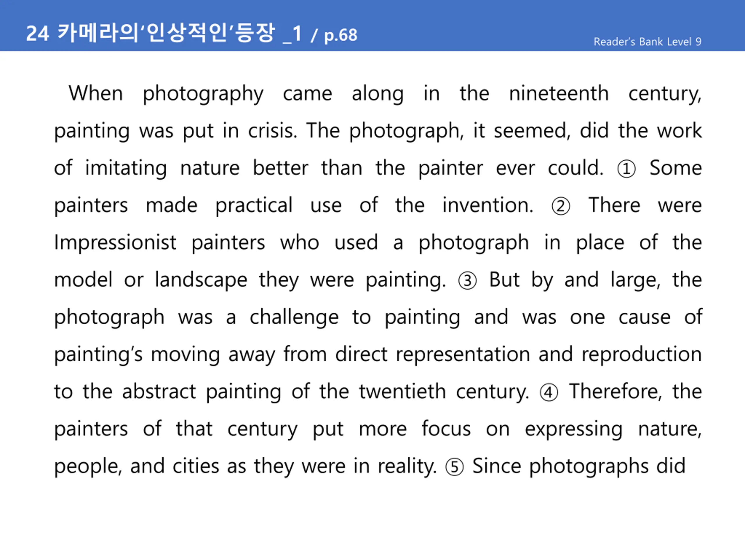 24 _1 / p.68 Reader s Bank Level 9 When painting was put in crisis. The photograph, it seemed, did the work of imitating nature better than the painter ever could. Some painters made practical use of the invention. There were Impressionist painters who used a photograph in place of the model or landscape they were painting. But by and large, the photograph was a challenge to painting and was one cause of painting s moving away from direct representation and reproduction to the abstract painting of the twentieth century. Therefore, the painters of that century put more focus on expressing nature, people, and cities as they were in reality. Since photographs did photography came along in the nineteenth century,