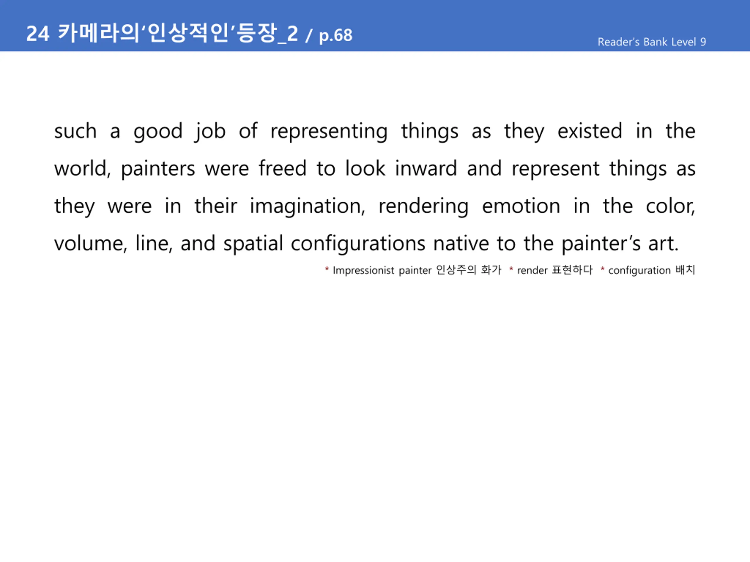 24 _2 / p.68 Reader s Bank Level 9 such a good job of representing things as they existed in the world, painters were freed to look inward and represent things as they were in their imagination, rendering emotion in the color, volume, line, and spatial configurations native to the painter s art. * Impressionist painter * render * configuration