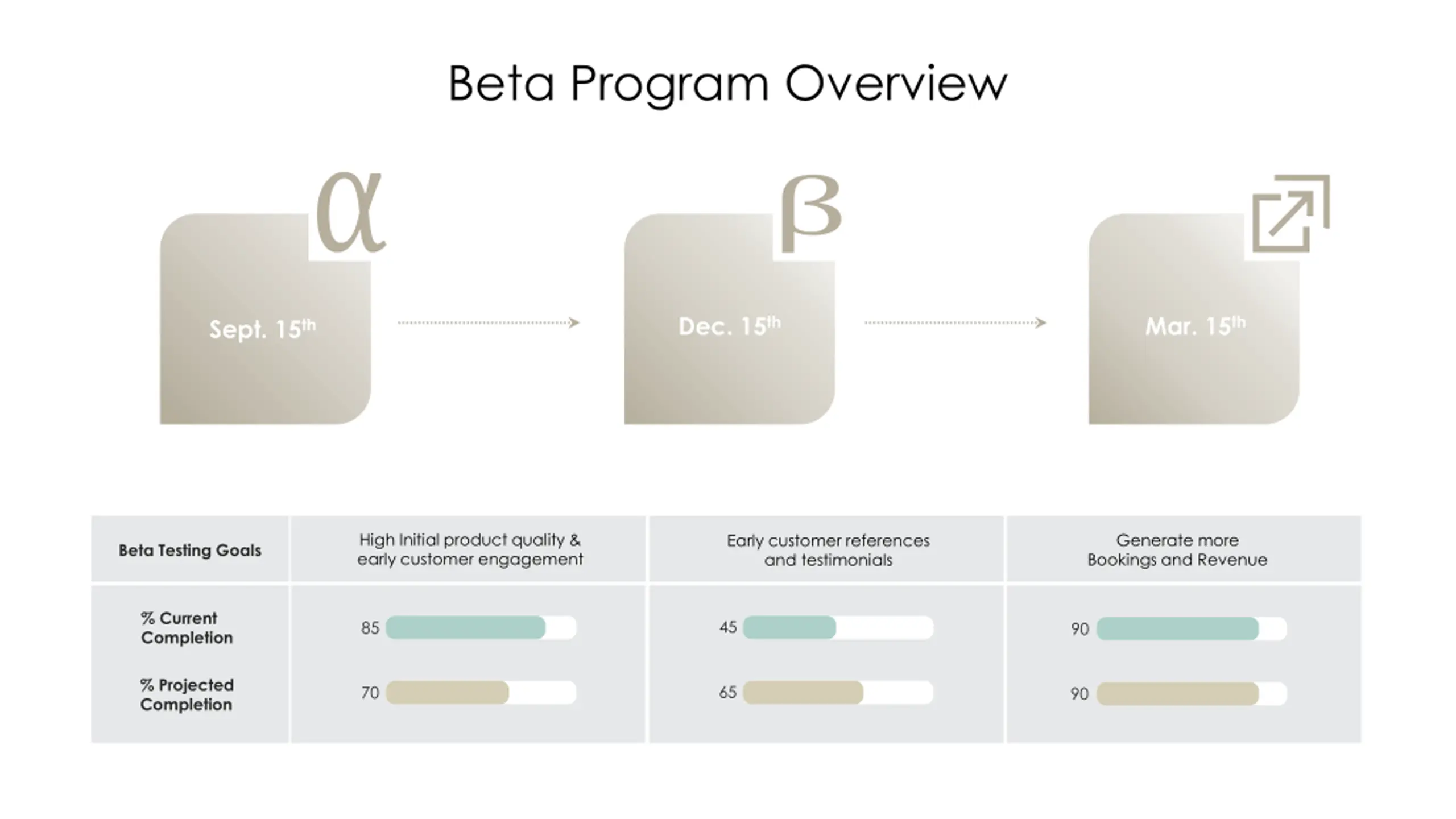 Beta Program Overview Mar. 15th Dec. 15th Sept. 15th High Initial product quality & early customer engagement Generate more Bookings and Revenue Early customer references and testimonials Beta Testing Goals % Current Completion 45 85 90 % Projected Completion 65 70 90