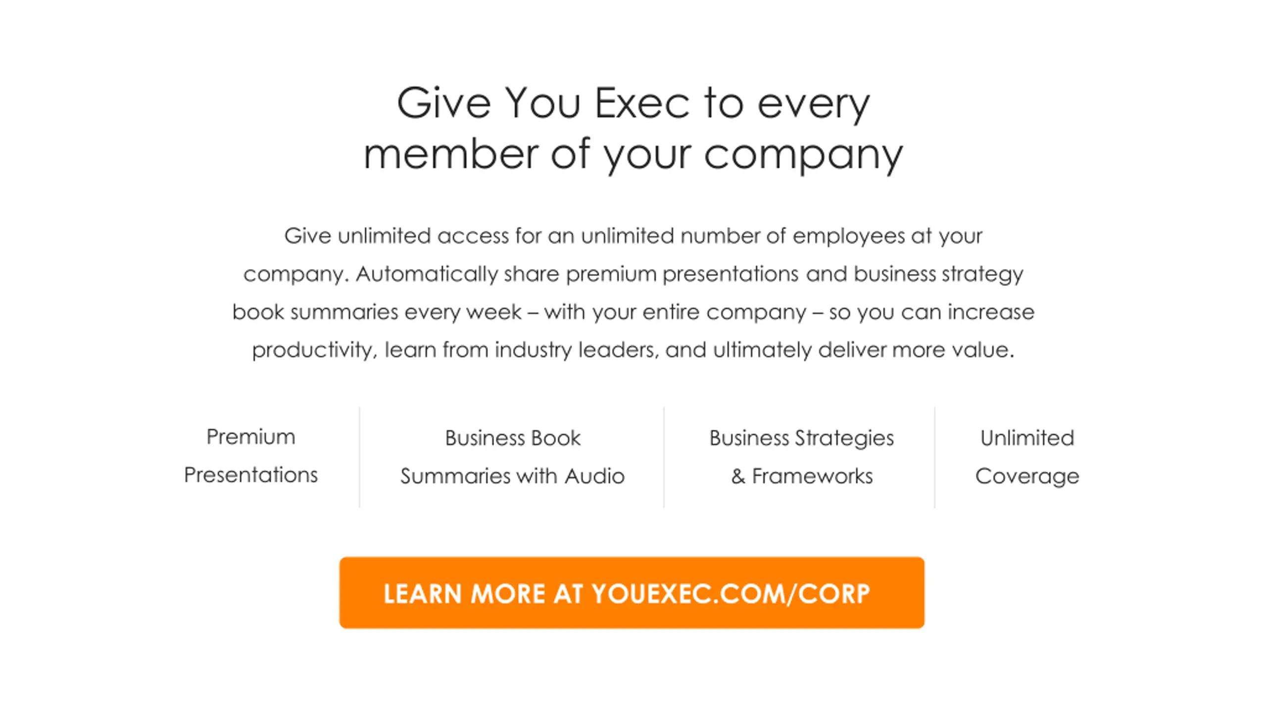 Give You Exec to every member of your company Give unlimited access for an unlimited number of employees at your company. Automatically share premium presentations and business strategy book summaries every week with your entire company so you can increase productivity, learn from industry leaders, and ultimately deliver more value. Premium Business Book Business Strategies Unlimited Presentations Summaries with Audio & Frameworks Coverage LEARN MORE AT YOUEXEC.COM/CORP LEARN MORE AT YOUEXEC.COM/CORP