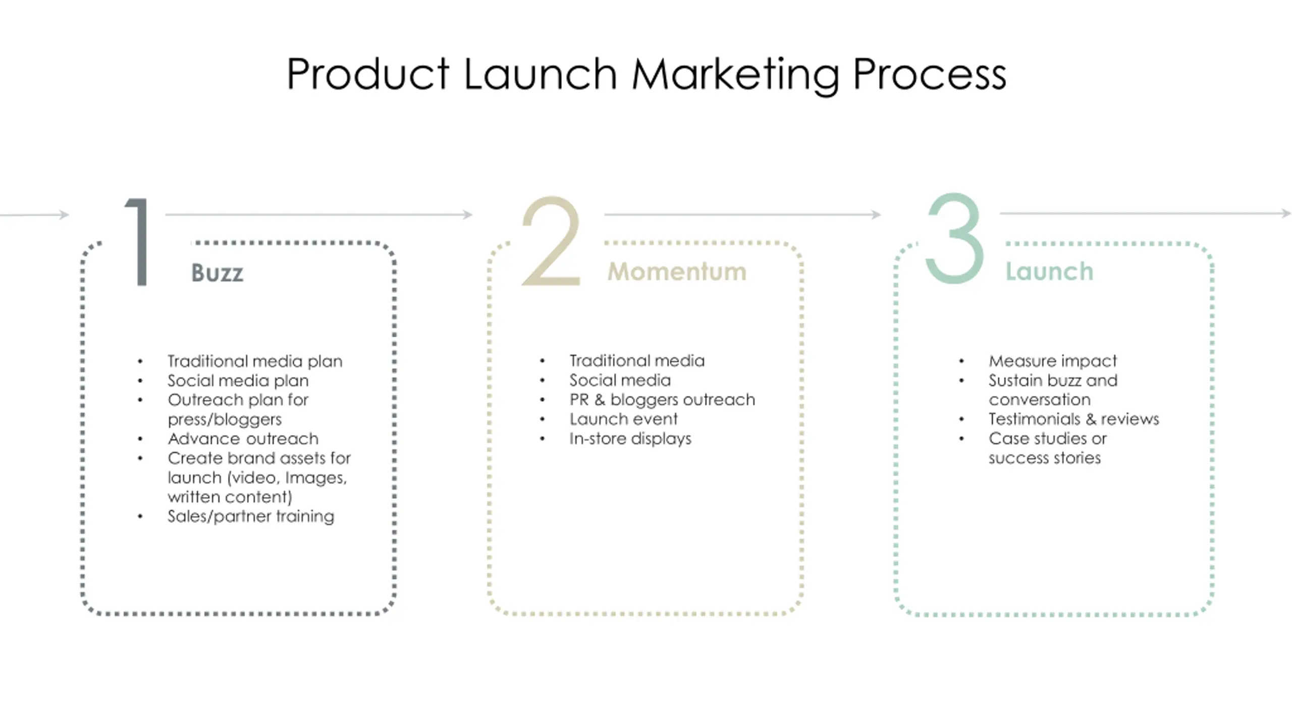 Product Launch Marketing Process 3 2 1 Launch Momentum Buzz Traditional media Social media PR & bloggers outreach Launch event In-store displays Measure impact Sustain buzz and conversation Testimonials & reviews Case studies or success stories Traditional media plan Social media plan Outreach plan for press/bloggers Advance outreach Create brand assets for launch (video, Images, written content) Sales/partner training