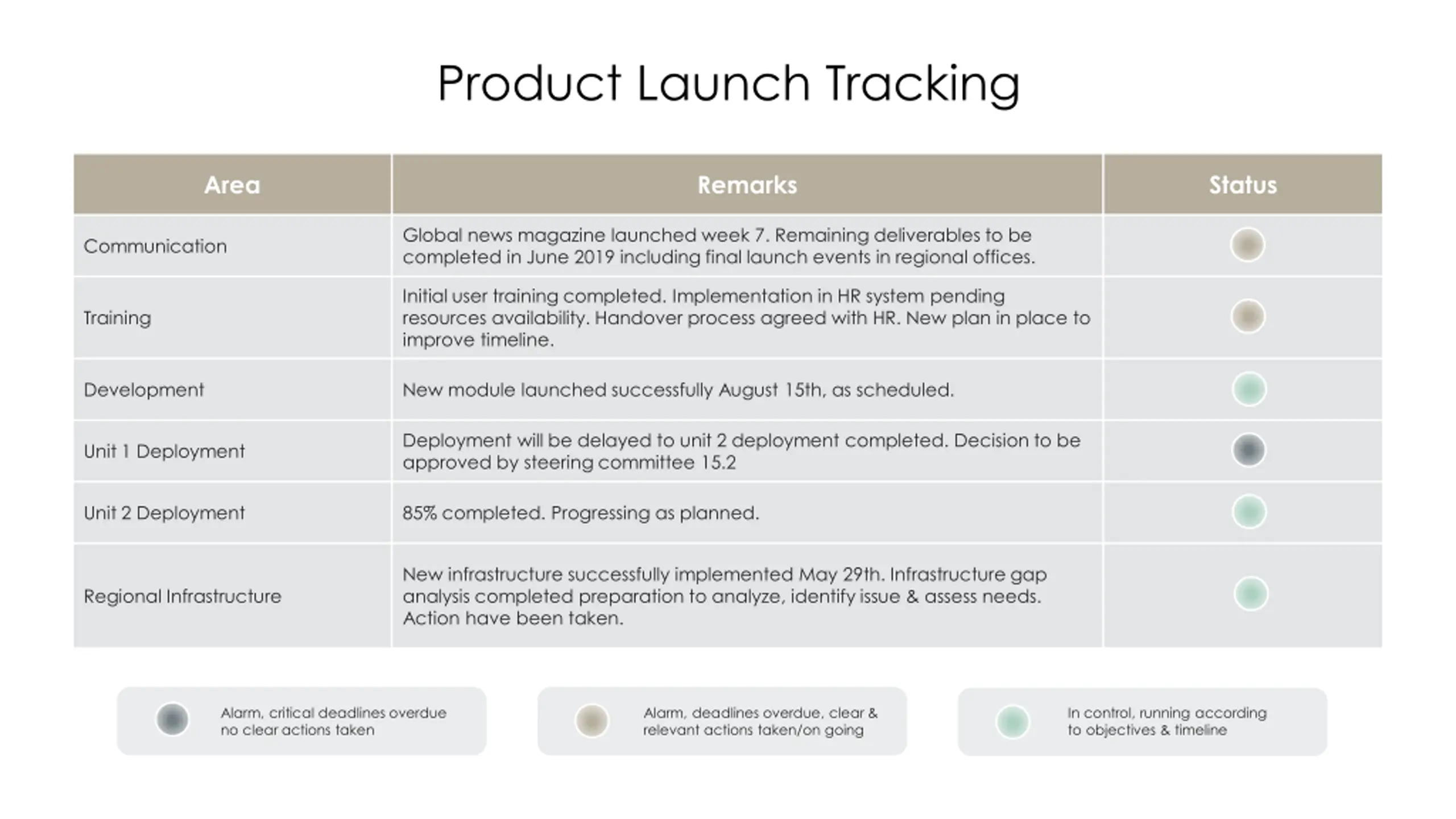Product Launch Tracking Area Remarks Status Global news magazine launched week 7. Remaining deliverables to be completed in June 2019 including final launch events in regional offices. Communication Initial user training completed. Implementation in HR system pending resources availability. Handover process agreed with HR. New plan in place to improve timeline. Training Development New module launched successfully August 15th, as scheduled. Deployment will be delayed to unit 2 deployment completed. Decision to be approved by steering committee 15.2 Unit 1 Deployment Unit 2 Deployment 85% completed. Progressing as planned. New infrastructure successfully implemented May 29th. Infrastructure gap analysis completed preparation to analyze, identify issue & assess needs. Action have been taken. Regional Infrastructure Alarm, critical deadlines overdue no clear actions taken Alarm, deadlines overdue, clear & relevant actions taken/on going In control, running according to objectives & timeline