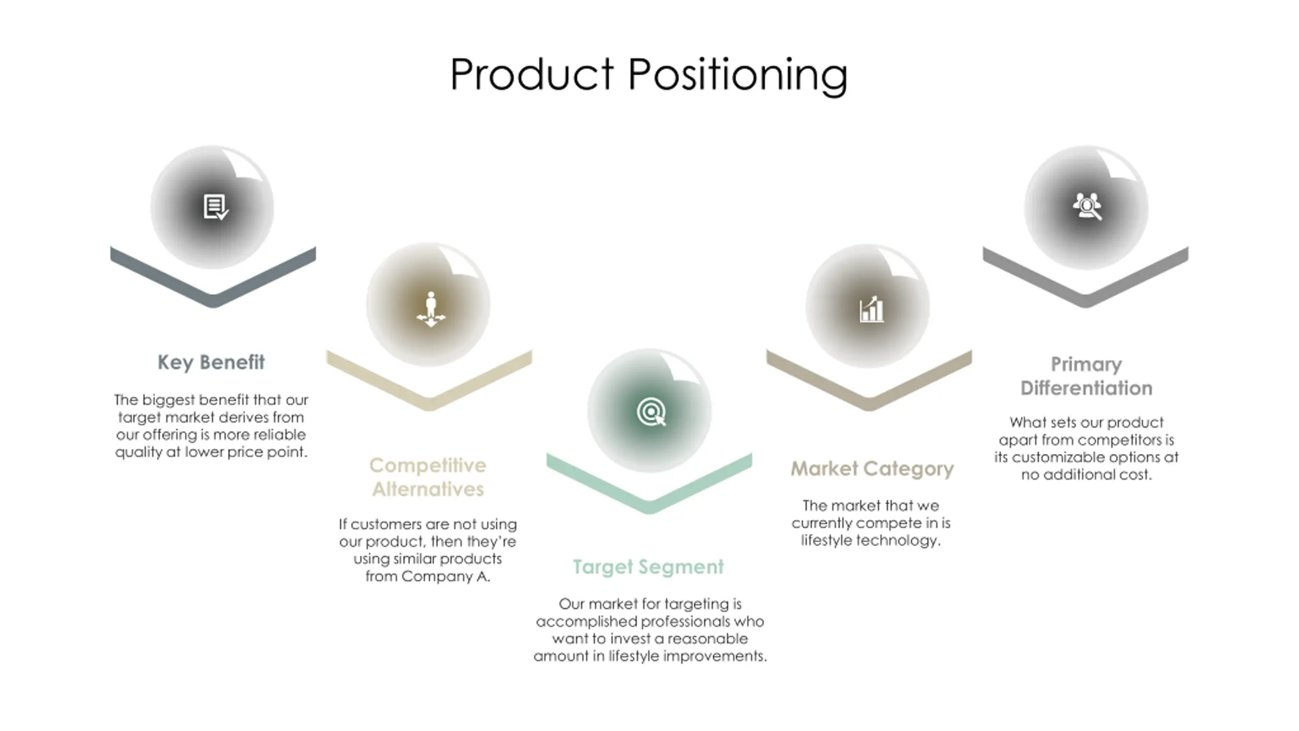 Product Positioning Key Benefit Primary Differentiation The biggest benefit that our target market derives from our offering is more reliable quality at lower price point. What sets our product apart from competitors is its customizable options at no additional cost. Competitive Alternatives Market Category The market that we currently compete in is lifestyle technology. If customers are not using our product, then they re using similar products from Company A. Target Segment Our market for targeting is accomplished professionals who want to invest a reasonable amount in lifestyle improvements.