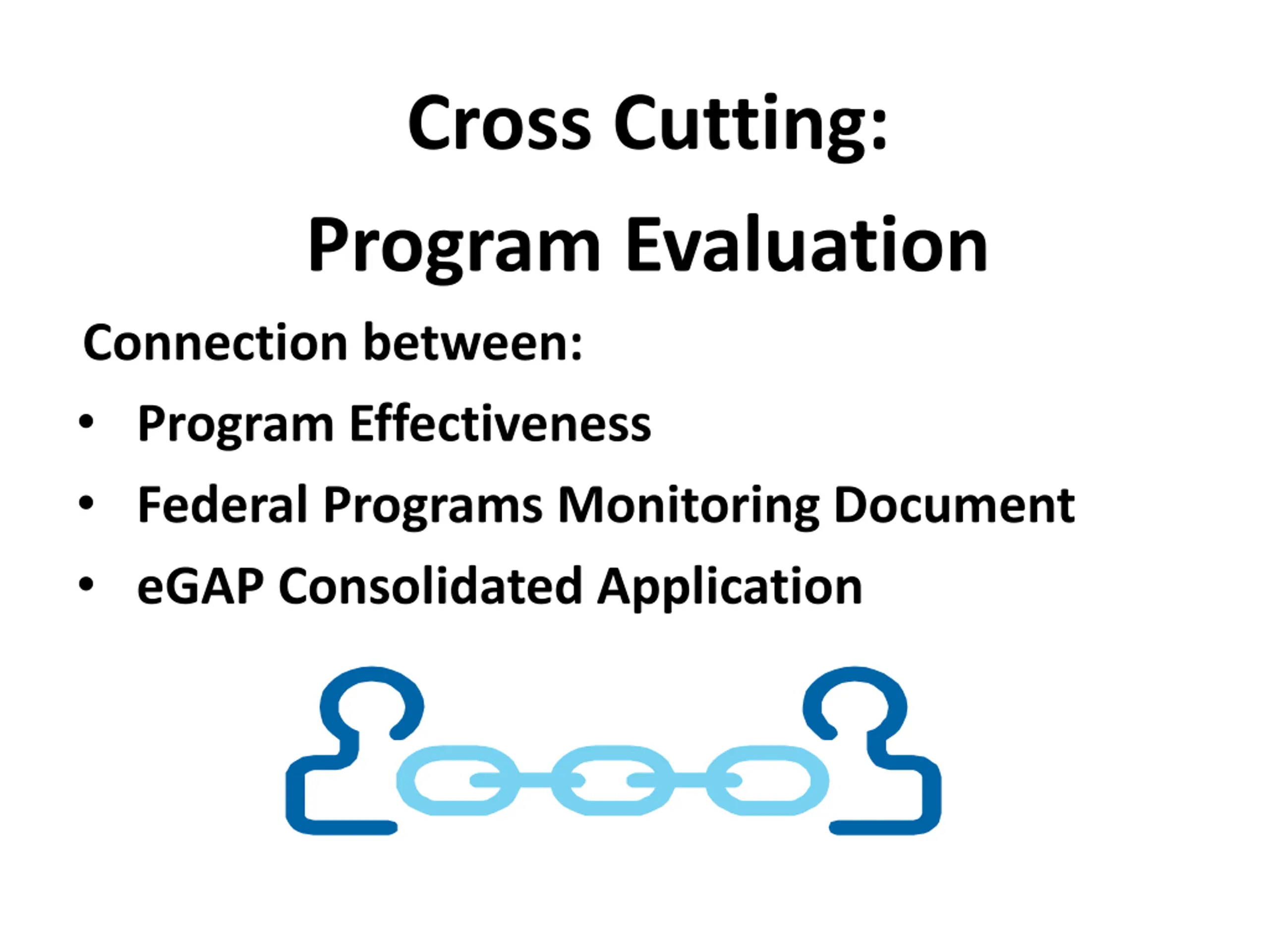Cross Cutting: Program Evaluation Connection between: Program Effectiveness Federal Programs Monitoring Document eGAP Consolidated Application