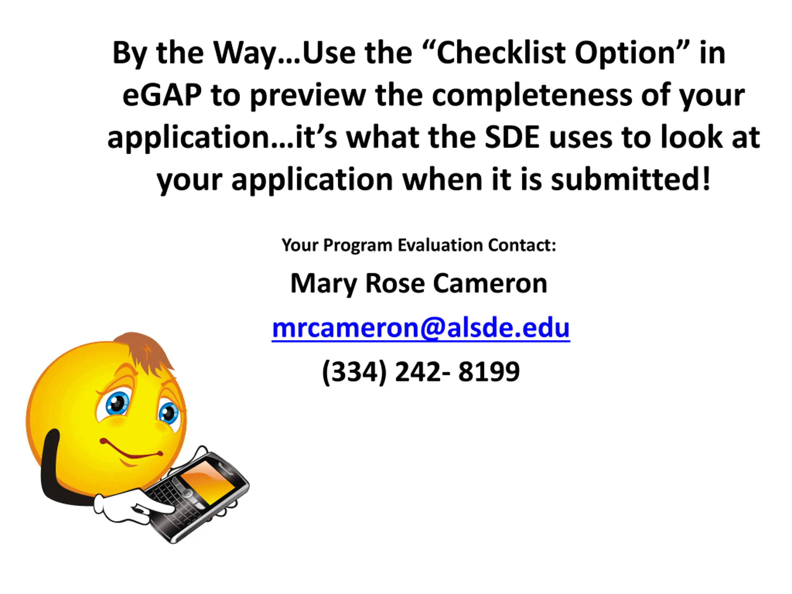 By the WayUse the Checklist Option in eGAP to preview the completeness of your application it s what the SDE uses to look at your application when it is submitted! Your Program Evaluation Contact: Mary Rose Cameron mrcameron@alsde.edu (334) 242- 8199