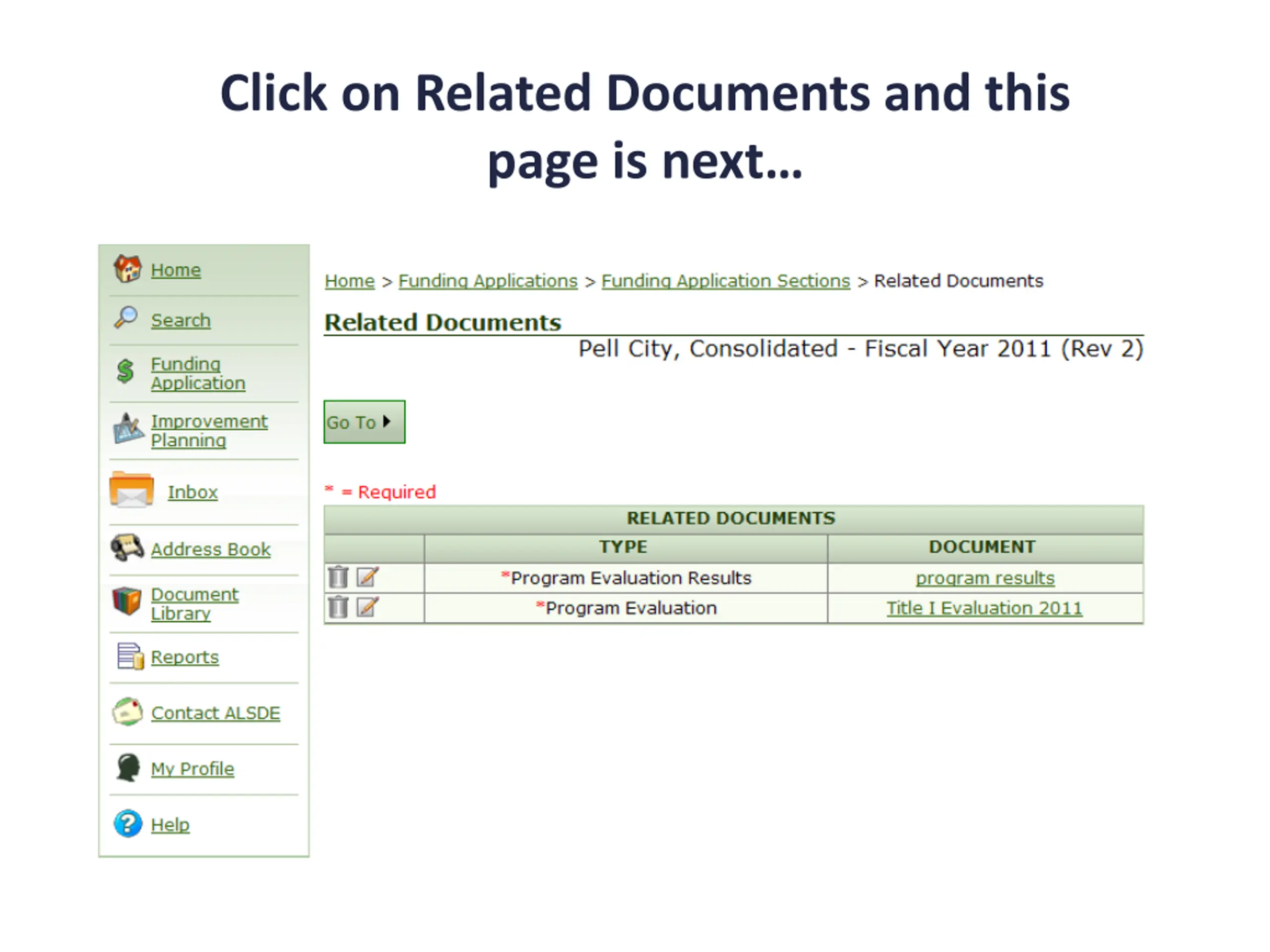 Plugging in Program Evaluations Required in eGAP Consolidated (Look for Related Documents under each separate funding source). For example: Under Title I, Schoolwide Budget Budget Details Related Documents Checklist