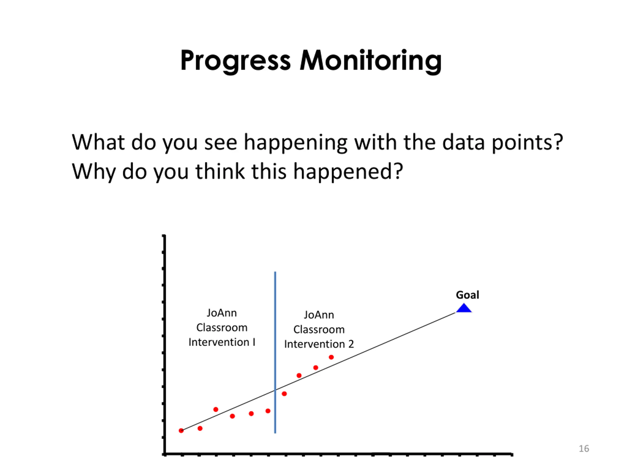 Progress Monitoring What do you see happening with the data points? Why do you think this happened? Goal JoAnn Classroom Intervention I JoAnn Classroom Intervention 2 16