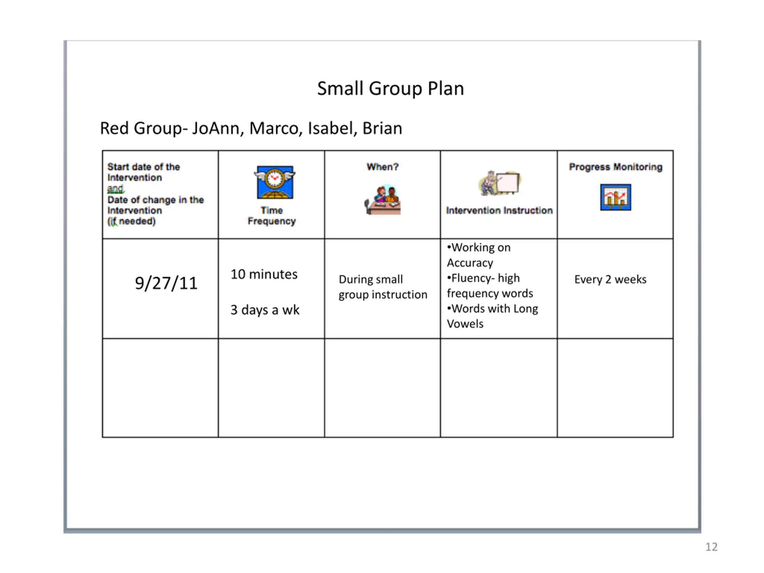 Small Group Plan Red Group- JoAnn, Marco, Isabel, Brian Working on Accuracy Fluency- high frequency words Words with Long Vowels 10 minutes During small group instruction Every 2 weeks 9/27/11 3 days a wk 12