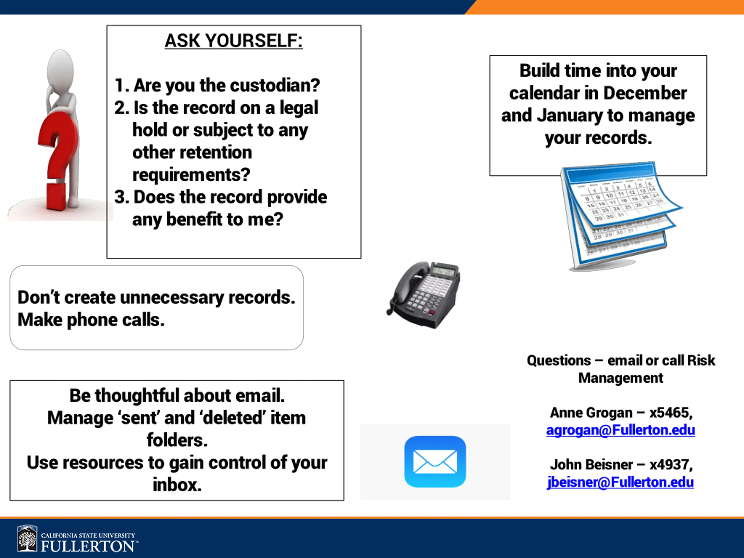 ASK YOURSELF: Build time into your calendar in December and January to manage your records. 1. Are you the custodian? 2. Is the record on a legal hold or subject to any other retention requirements? 3. Does the record provide any benefit to me? Don t create unnecessary records. Make phone calls. Questions email or call Risk Management Anne Grogan x5465, agrogan@Fullerton.edu Be thoughtful about email. Manage sent and deleted item folders. Use resources to gain control of your inbox. John Beisner x4937, jbeisner@Fullerton.edu